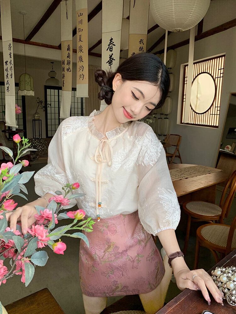 夏の中国風ボタンダウントップ女性、優しくてシック、美しい、超妖精、高級刺繍入り七分袖シャツ レッド サマー 夏物 857169467572223