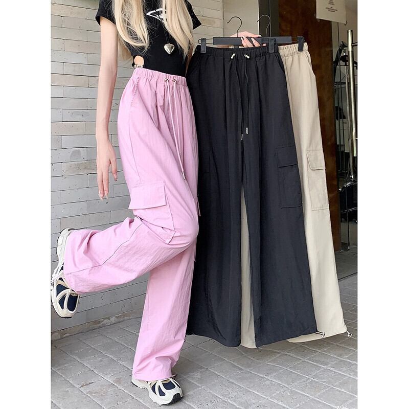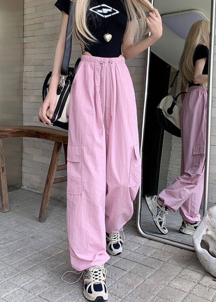 ピンクアメリカンスタイルオーバーオール女性の夏の薄い巾着脚ワイドレッグパンツ 2023 新しいカジュアルフロアモップロングパンツ サマー 夏物 ワイドパンツ 8571632413557213