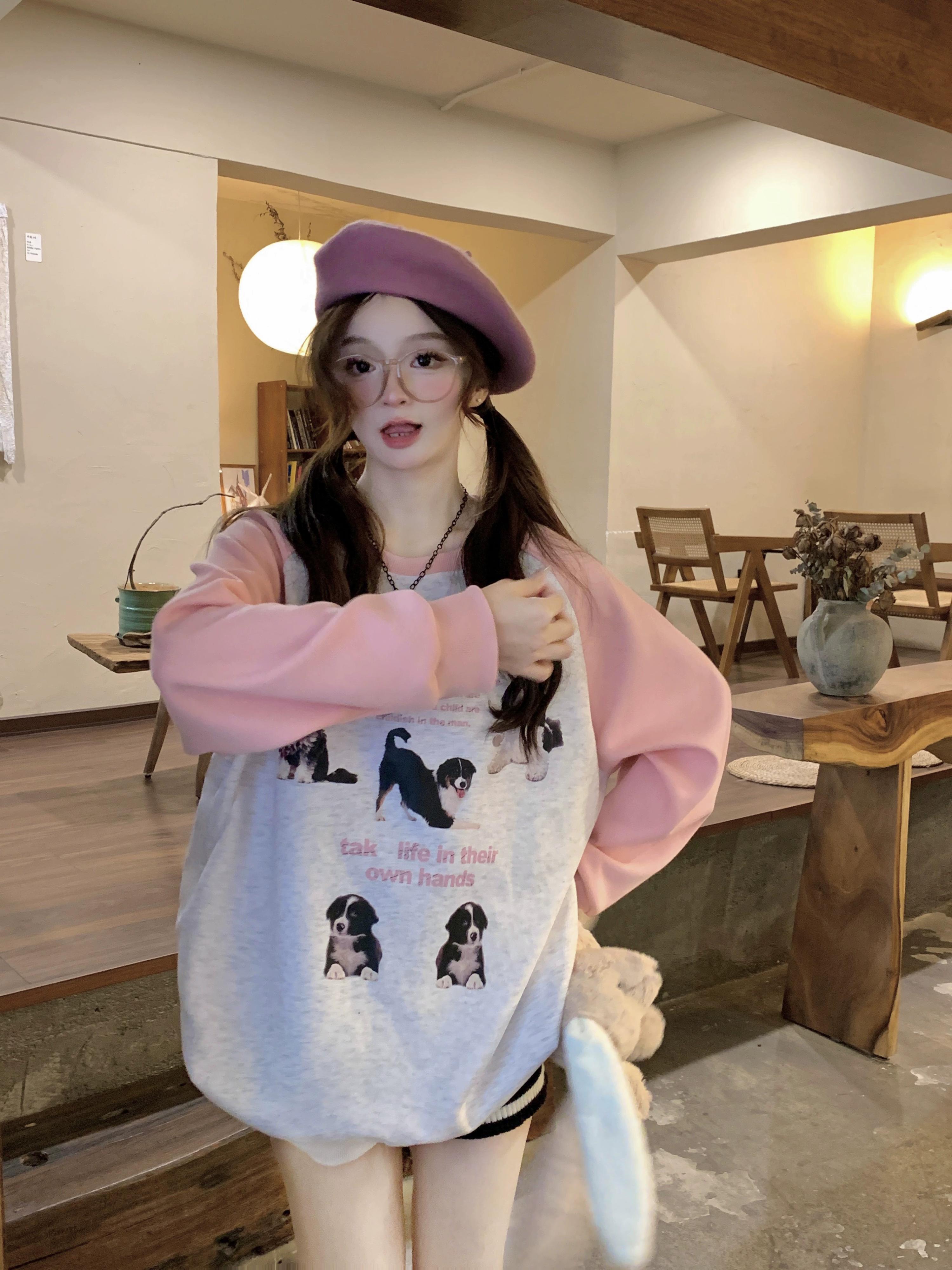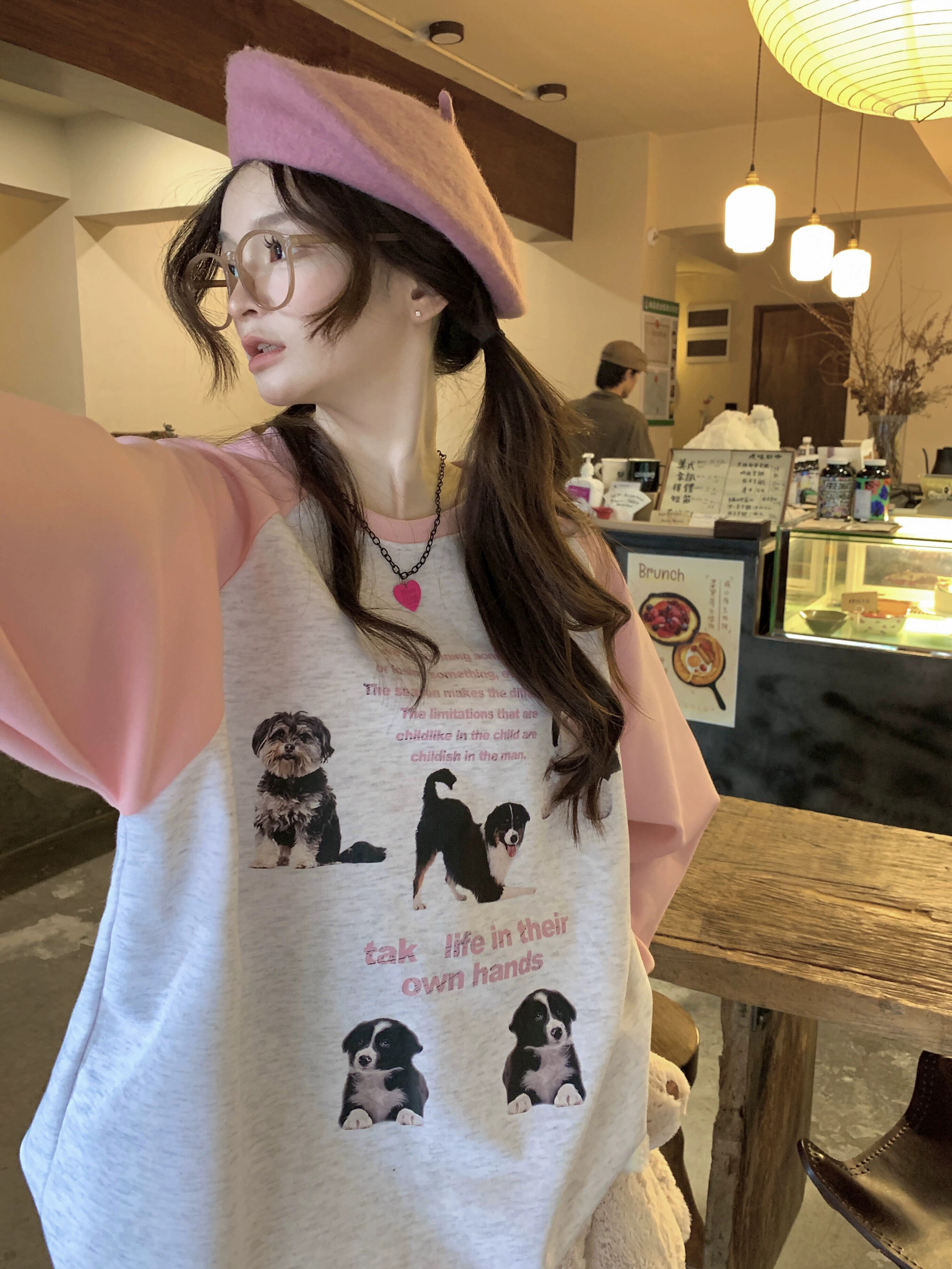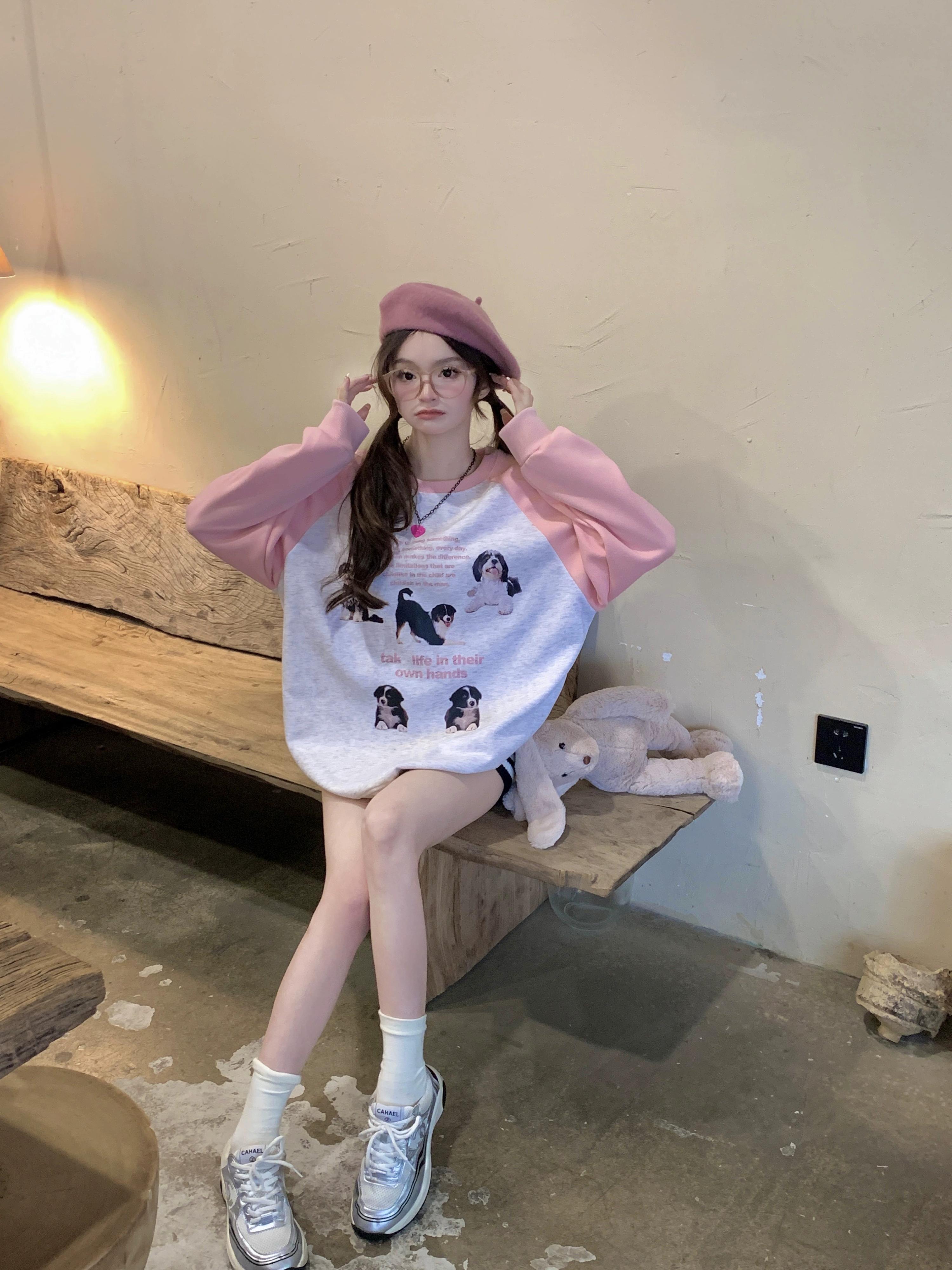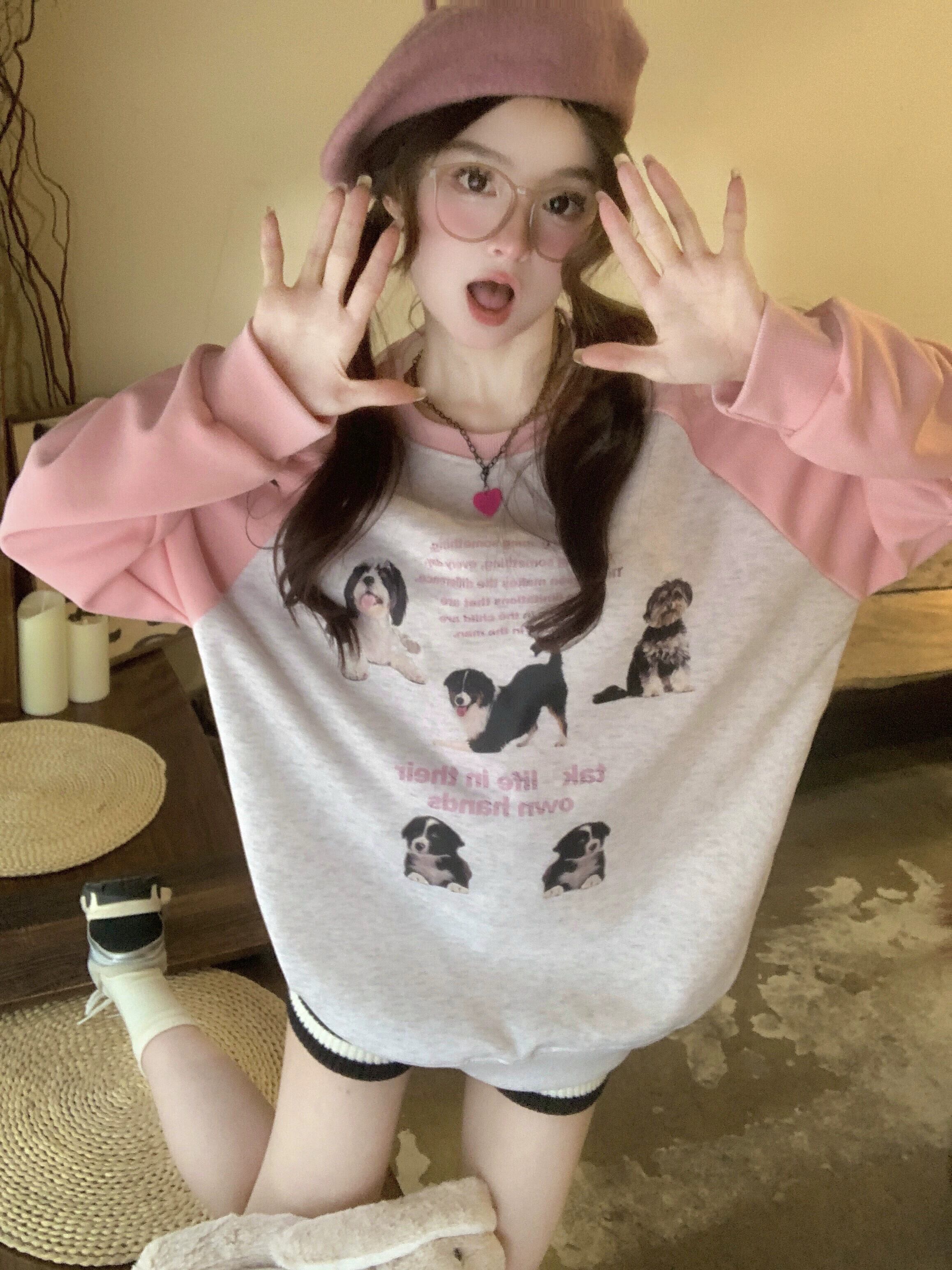 カラーブロックラグラン長袖Tシャツレディース2023初秋新作アメリカンレトロスタイル年齢を軽減するミドル丈トップス ロング オータム 秋物 8571654627023876