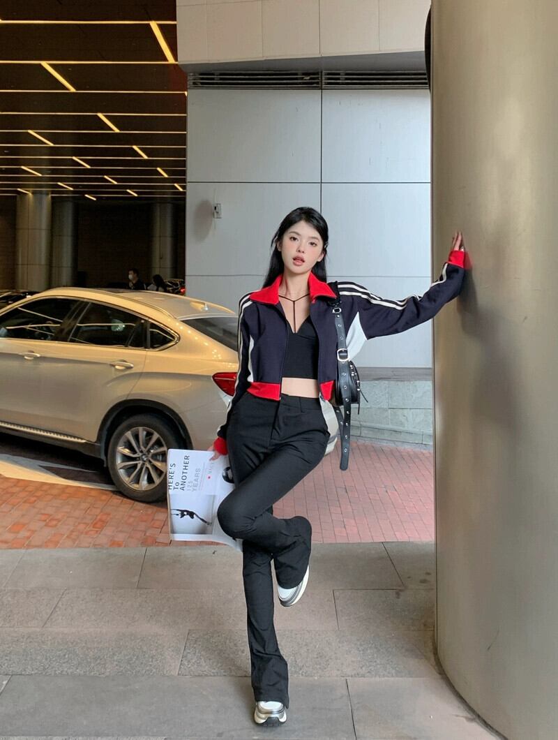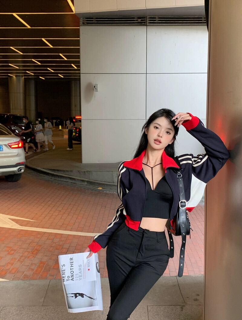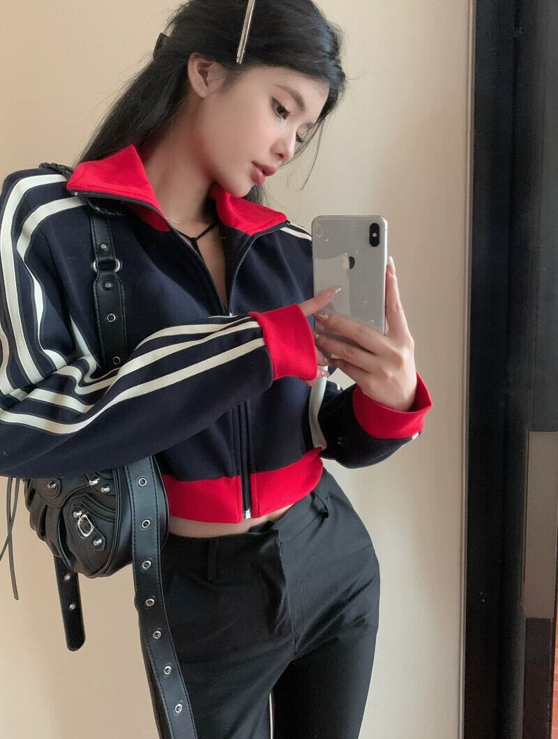 ダークブルージッパーカーディガンジャケット女性の2023初秋アメリカンレトロホットガールストリートショートジャケットトップ オータム 秋物 85716194877066