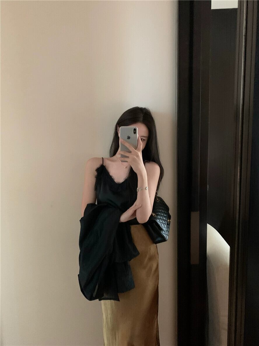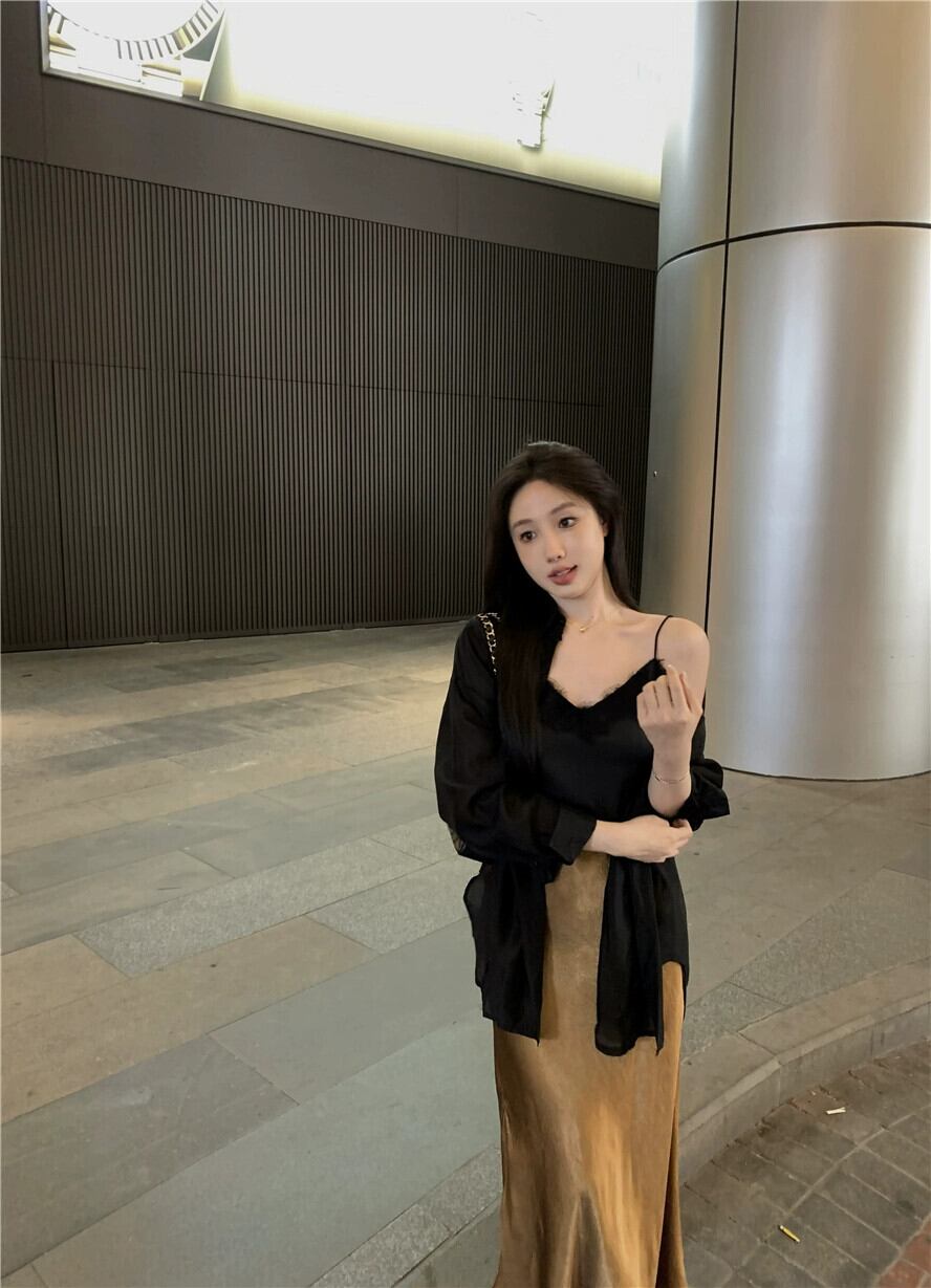 黒のシャツジャケット女性の 2023 秋の新作長袖シャツハイエンド怠惰なスタイルルーズニッチトップ ロング ブラック オータム 秋物 8571686292176404