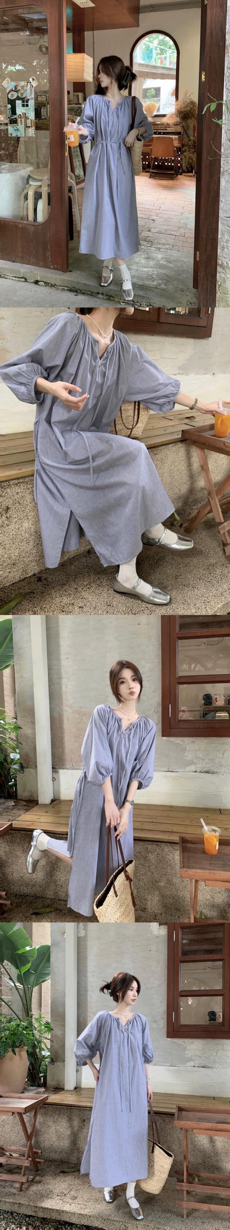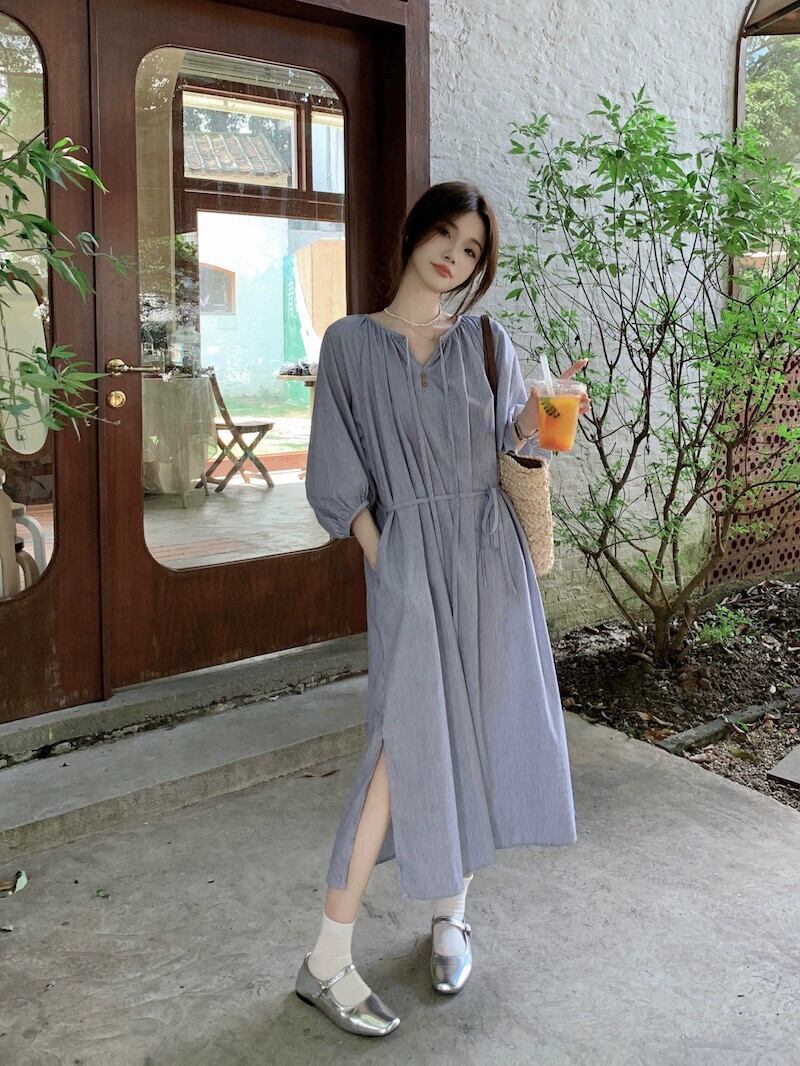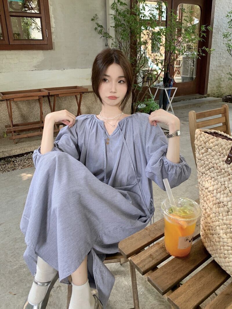 パフスリーブストライプドレスレディース2023夏新スタイル優しいスタイルシックなルーズカジュアルロングスカート サマー 夏物 8571637894234332