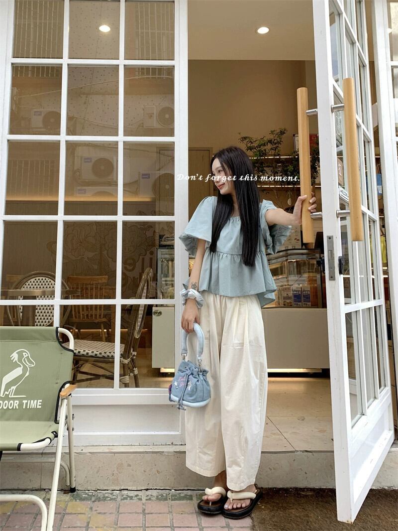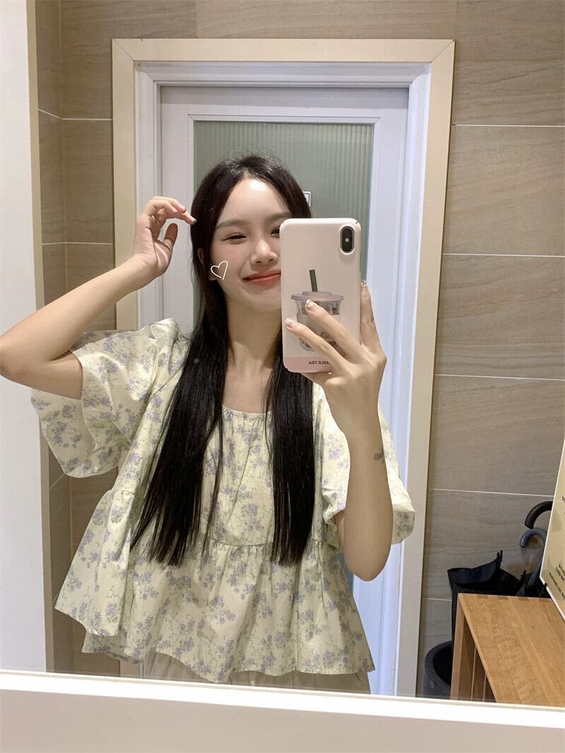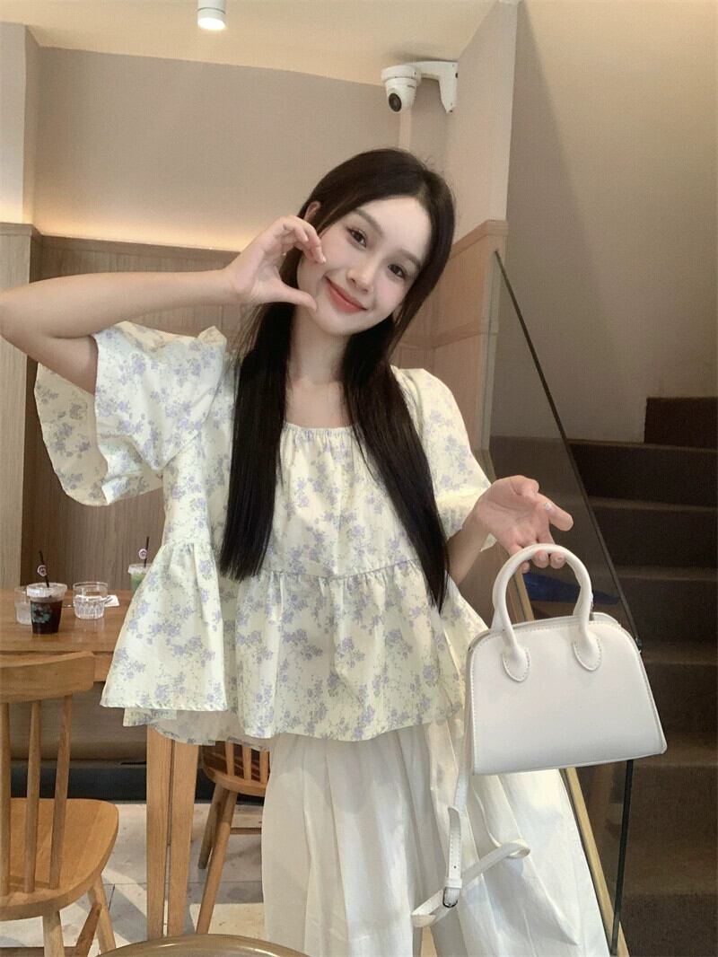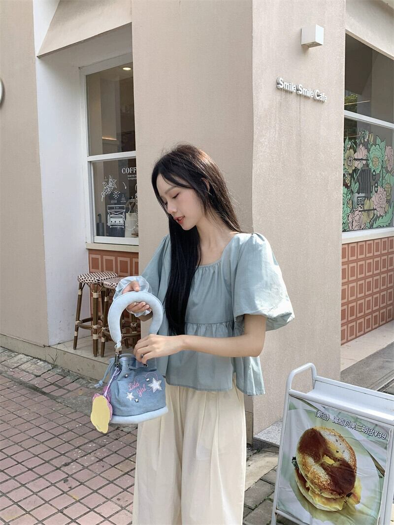 ベビードールトップス女性夏 2023 新しいスタイルフランス甘くて優しい小さなスクエアネックパフスリーブブルーシャツ 大人ガーリー スウィート キュート カジュアル サマー 夏物 スクウェア 857161278864932