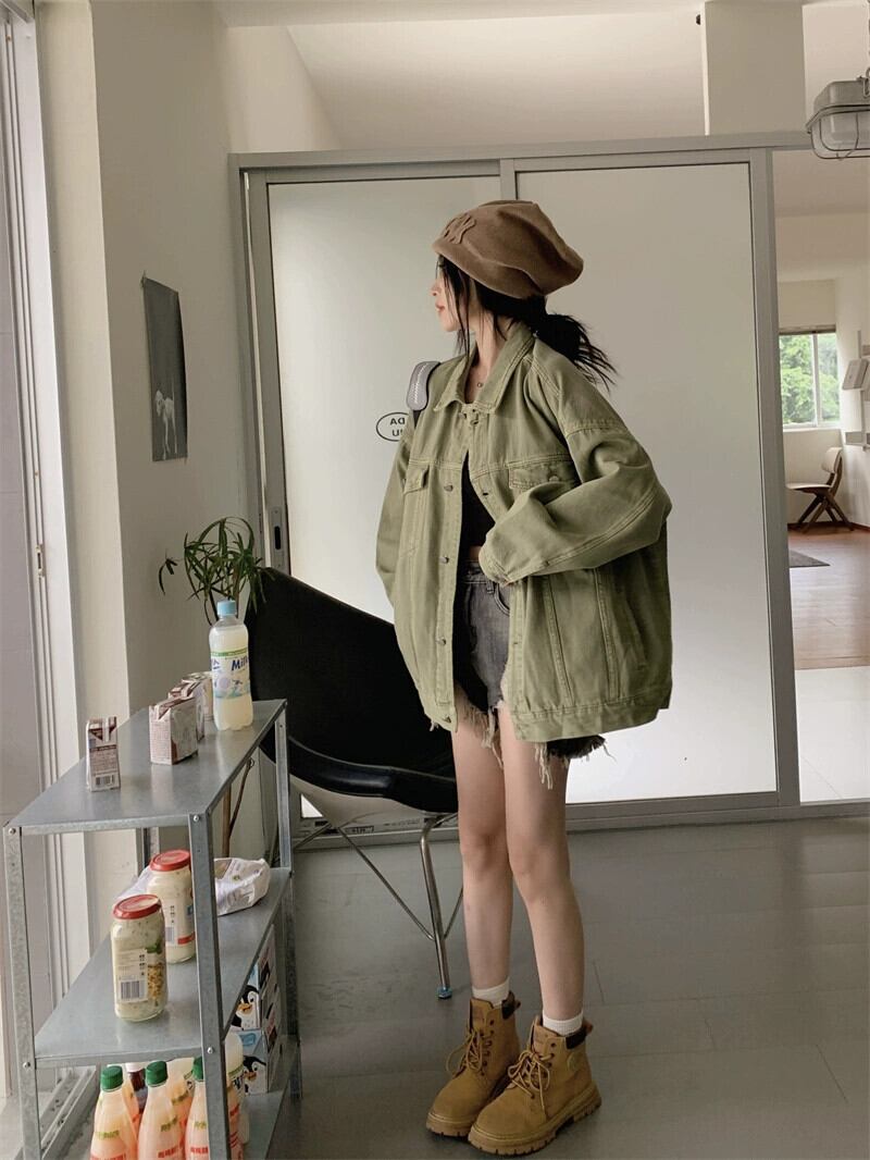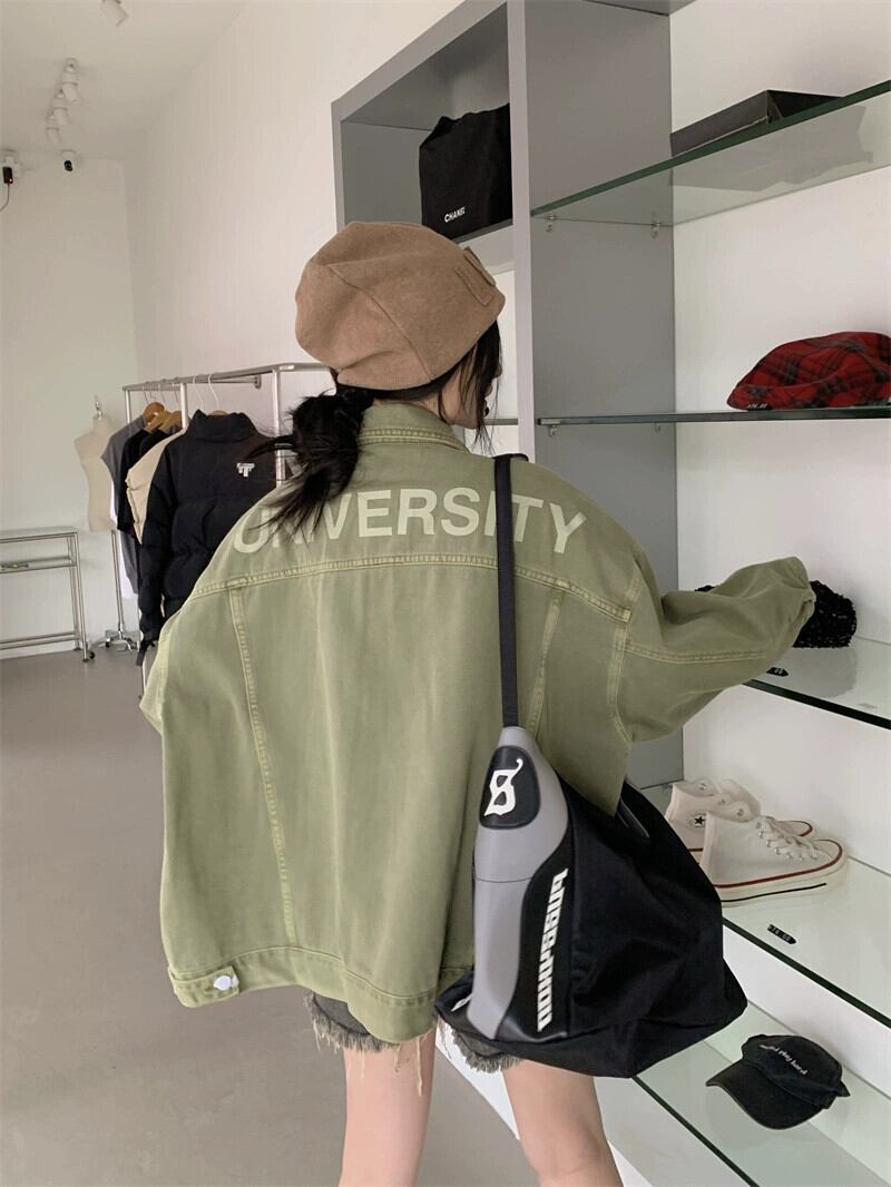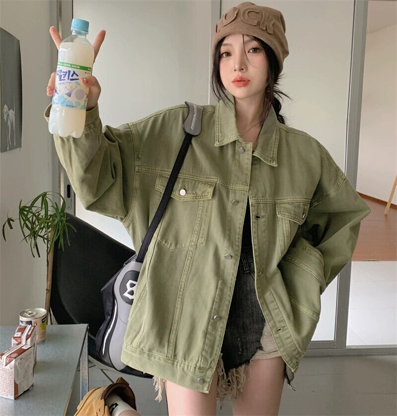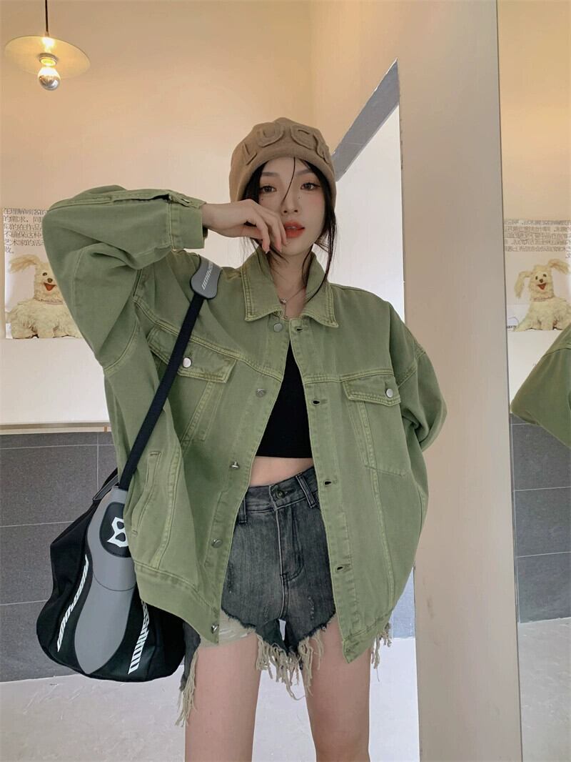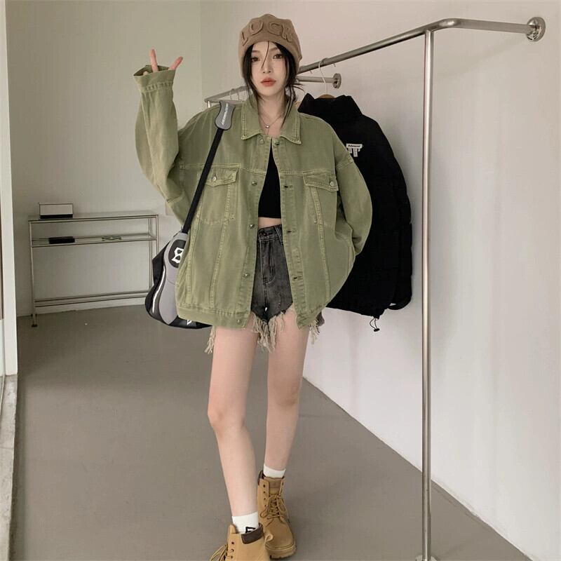 グリーンデニムジャケット女性の 2023 秋アメリカンレトロルーズ BF 怠惰なスタイルのワークウェアジャケットトップ オータム 秋物 8571631355874350