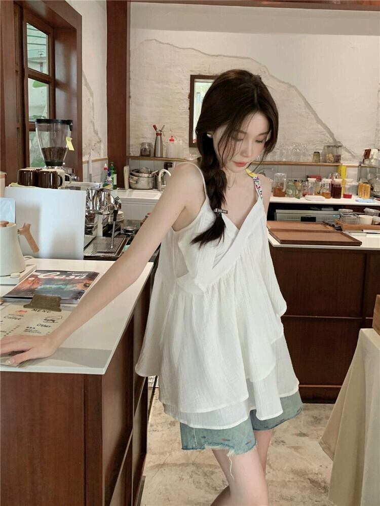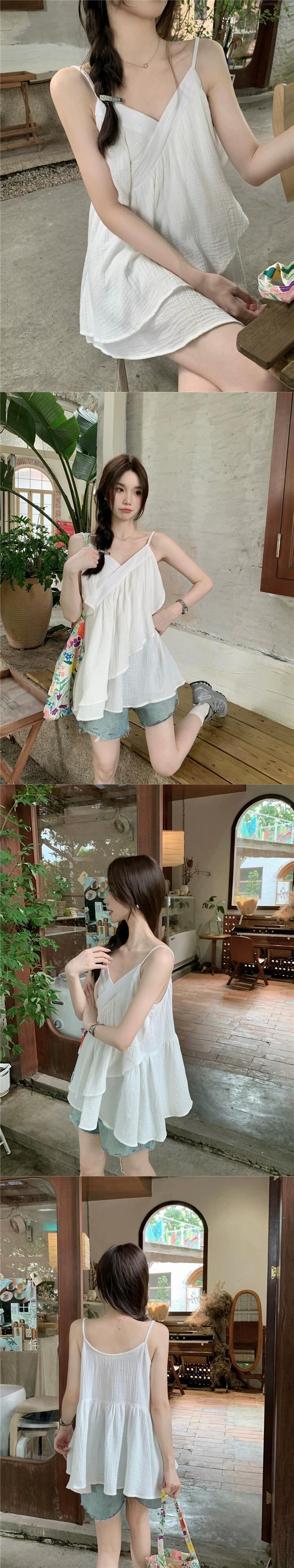 黒のキャミソールレディースインナーウェアとアウターウェア 2023 夏の新しいスタイルのフレンチシックなユニークなフリルノースリーブトップ ブラック サマー 夏物 8571610142249035