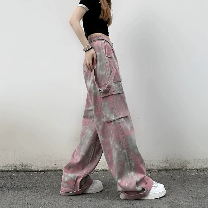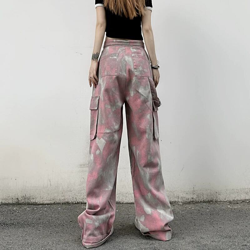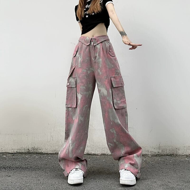 迷彩オーバーオール女性秋アメリカンレトロハイストリートトレンディなブランドヒップホップワイドレッグパンツハイウエストルーズカジュアルパンツ ハイウェスト オータム 秋物 ワイドパンツ 8571669506310235