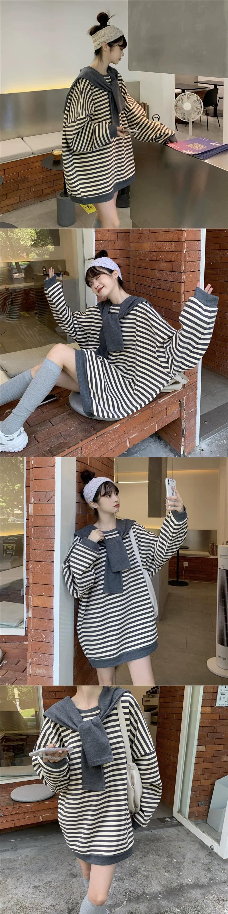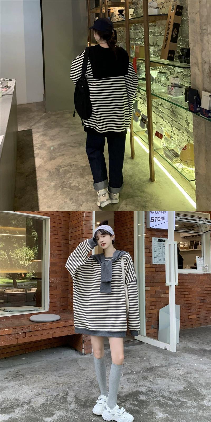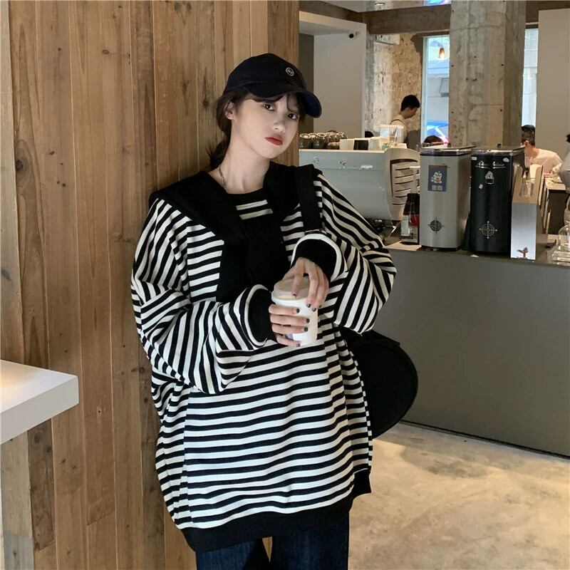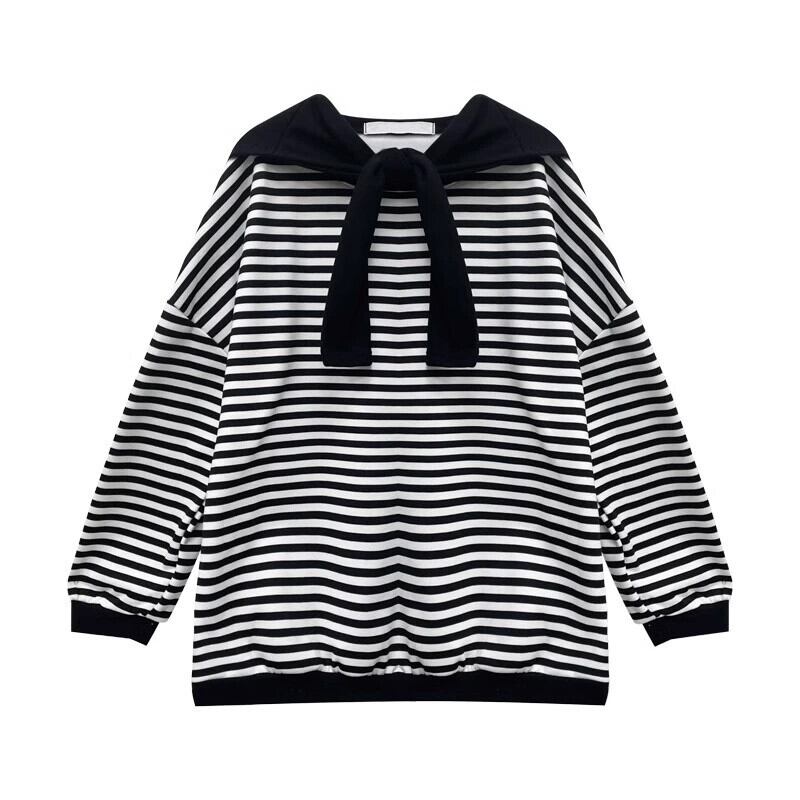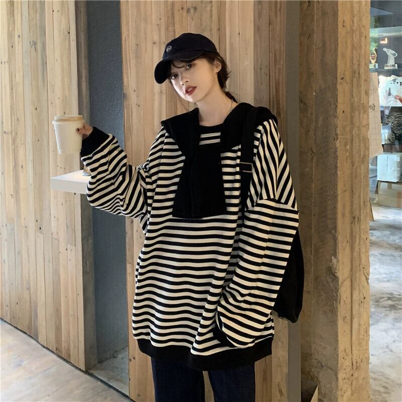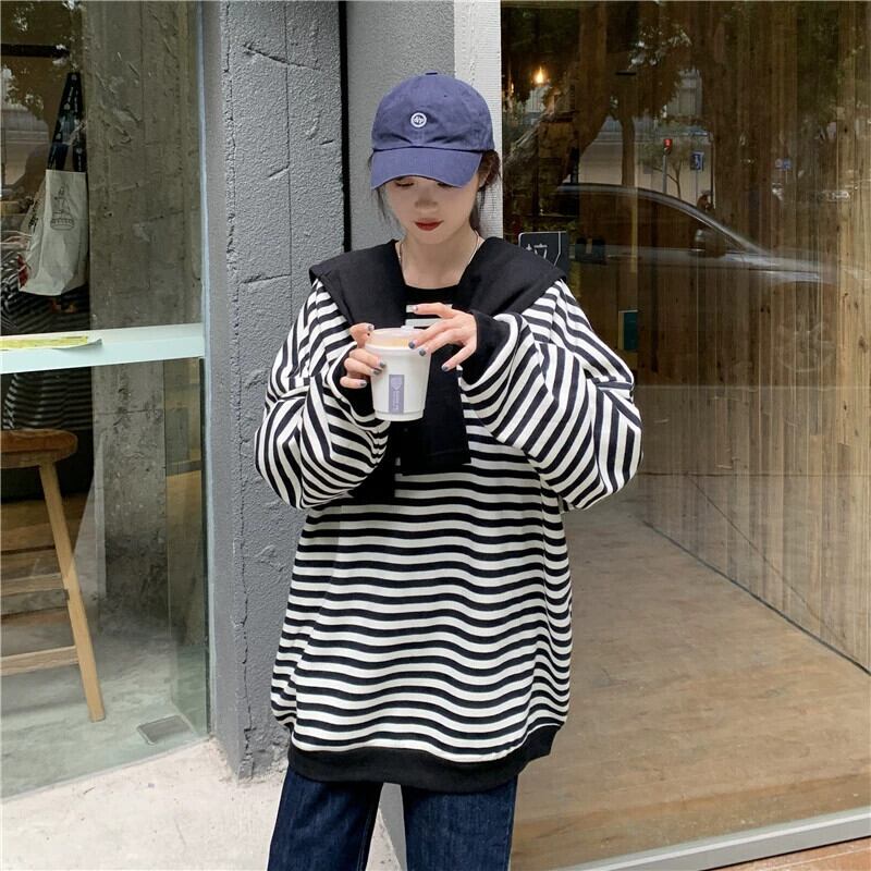 ストライプショールスウェットシャツレディース 2023 初秋の新アメリカンスタイル怠惰でシックなルーズ BF スタイルミッドレングストップス オータム 秋物 8571697248347747