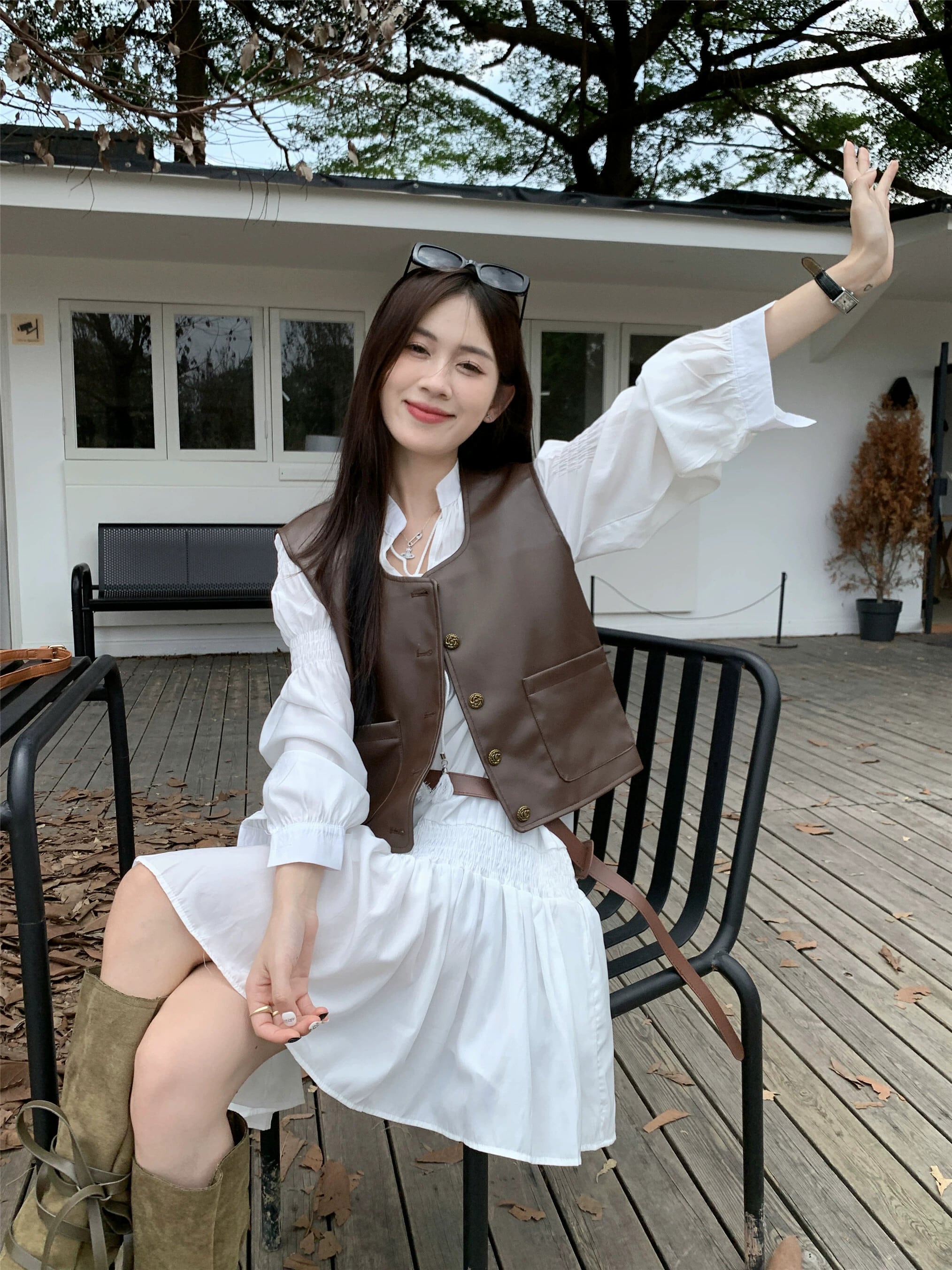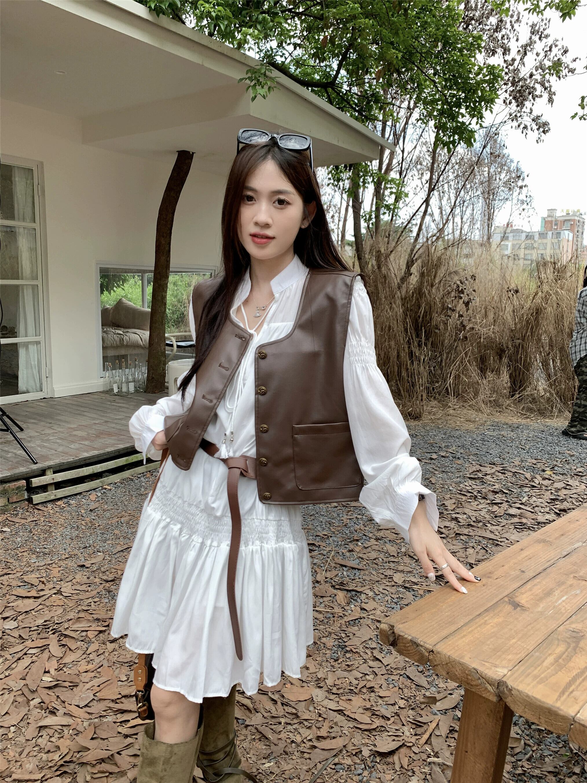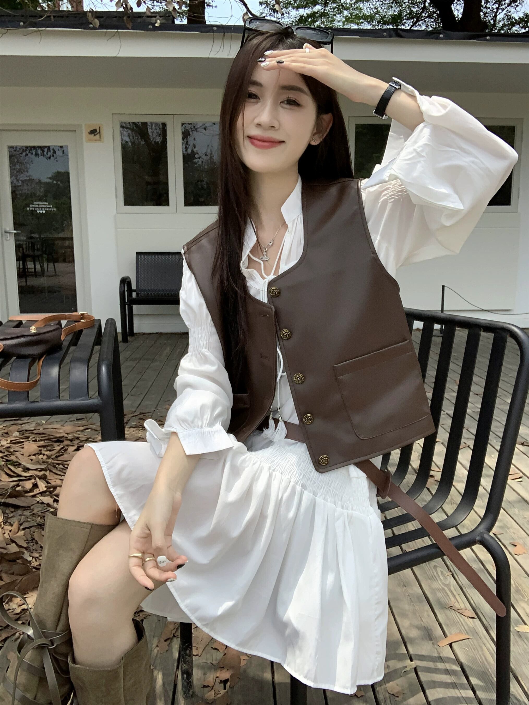 PU レザーベストジャケット女性ドレスベスト 2023 新しい秋スタイルレイヤードノースリーブショートベスト レッド 8571629626058417