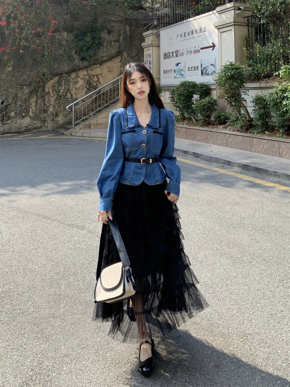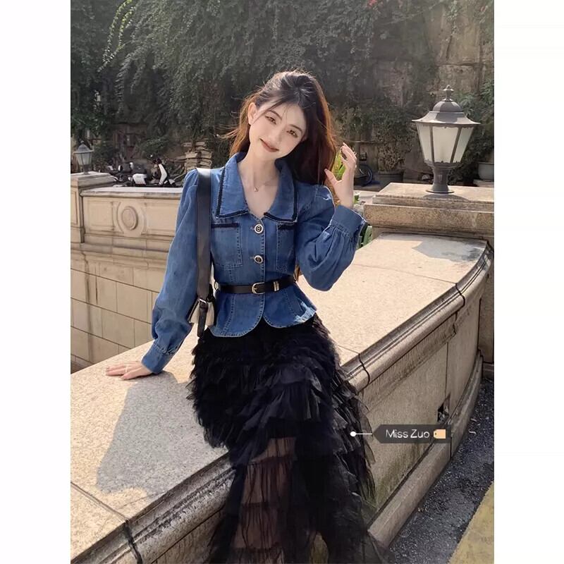 長袖デニムシャツ女性 2023 初秋の新スタイルライト成熟した香港スタイルのレトロな気質ハイエンドウエストショートトップ ロング オータム 秋物 8571639334737253