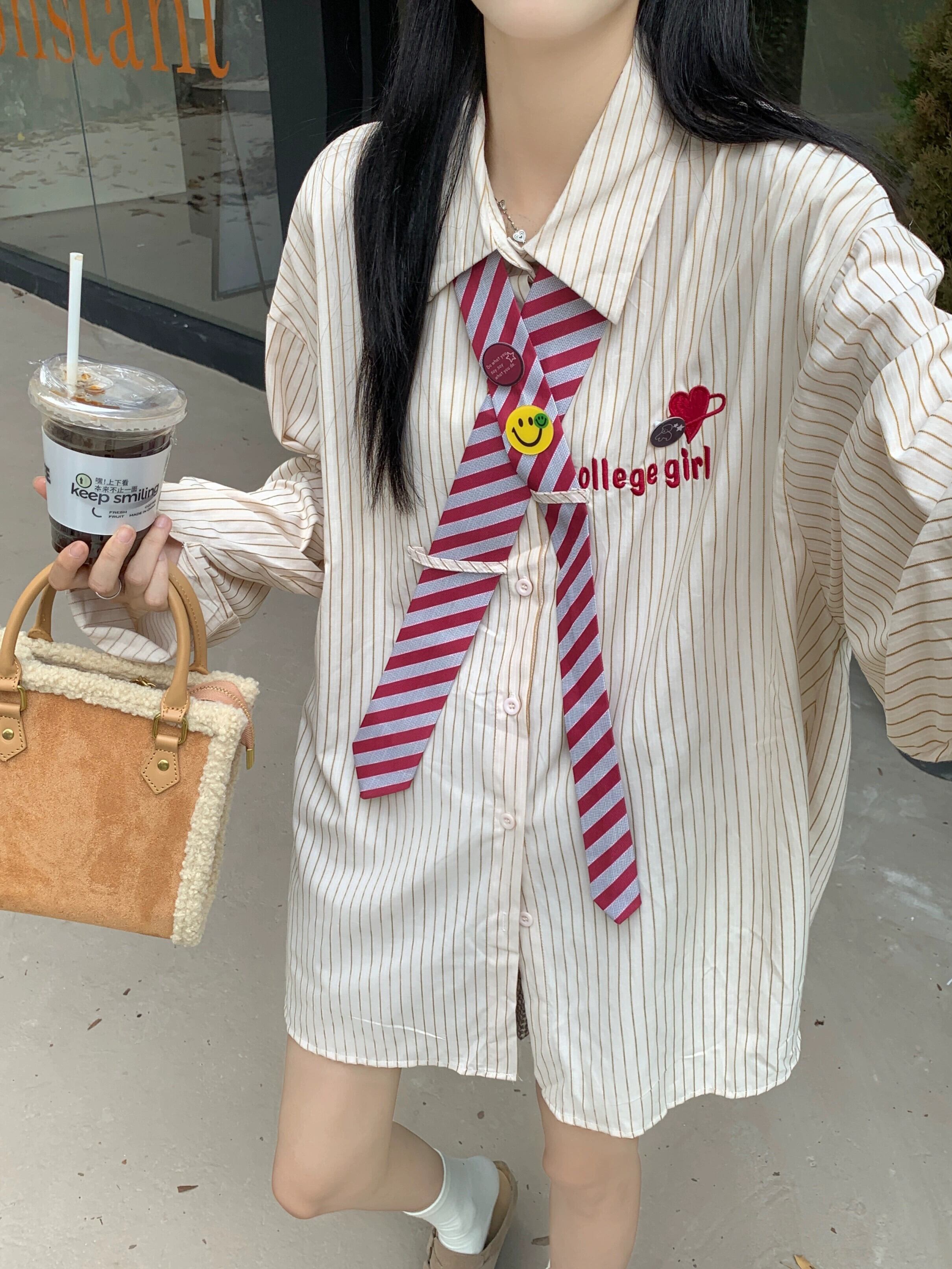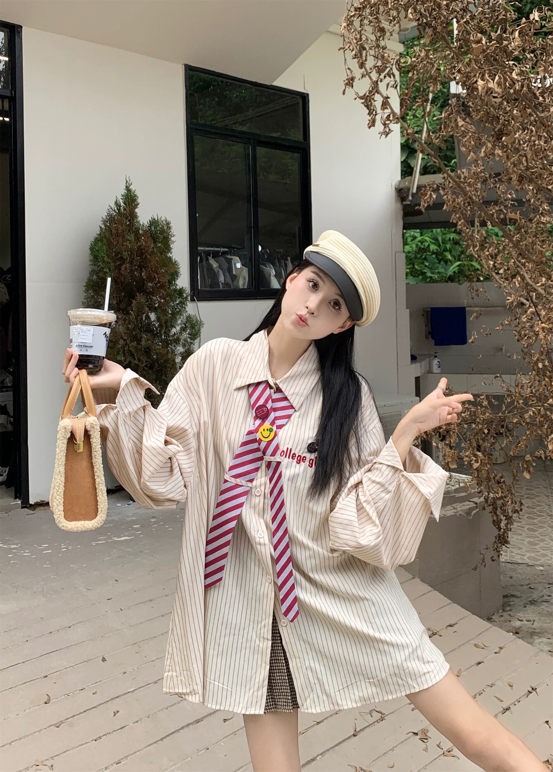 刺繍ストライプシャツレディースデザインニッチ長袖シャツ2023初秋の新しいカレッジスタイルルーズトップ ロング レッド オータム 秋物 857162660918177