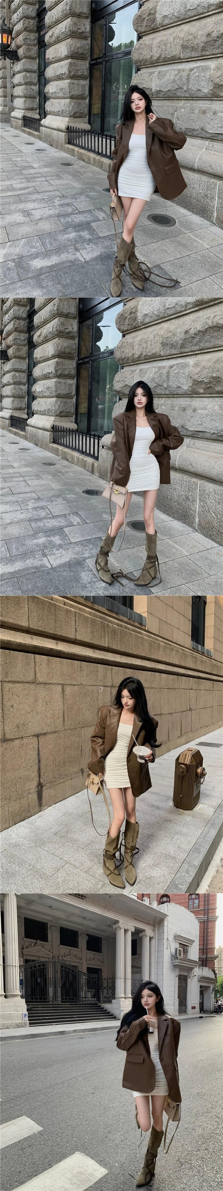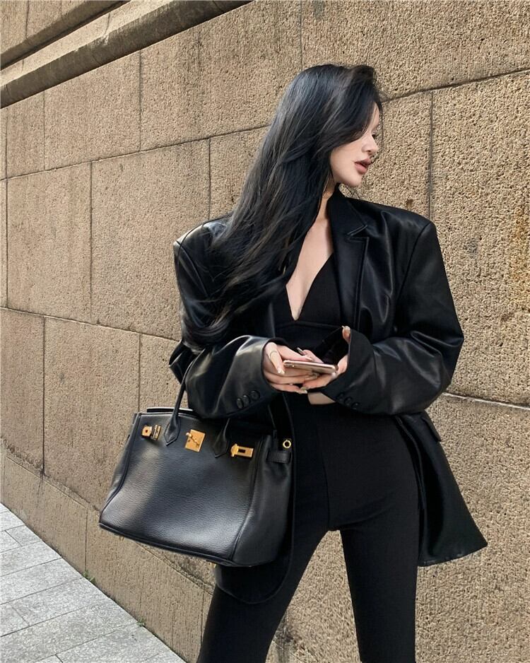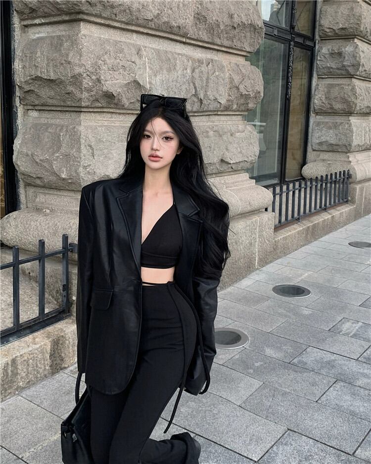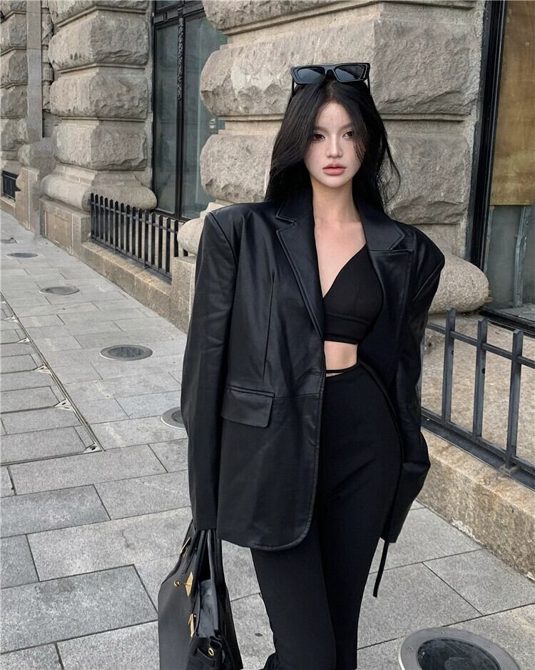 黒革のスーツのジャケットの女性 2023 秋の新香港スタイルのハイエンドストリートハンサムなオートバイのジャケット ブラック オータム 秋物 レザー 8571629514873093