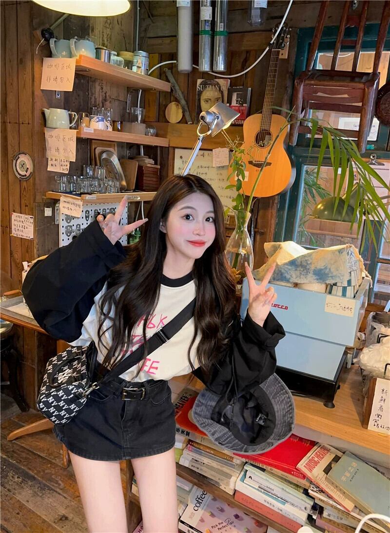 カラーブロックラグラン長袖 T シャツレディース 2023 秋の新デザインニッチアメリカンレトロルーズトップトレンド ロング オータム 秋物 Tシャツ 857161073431366