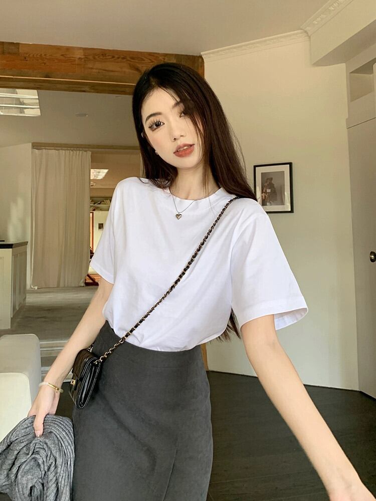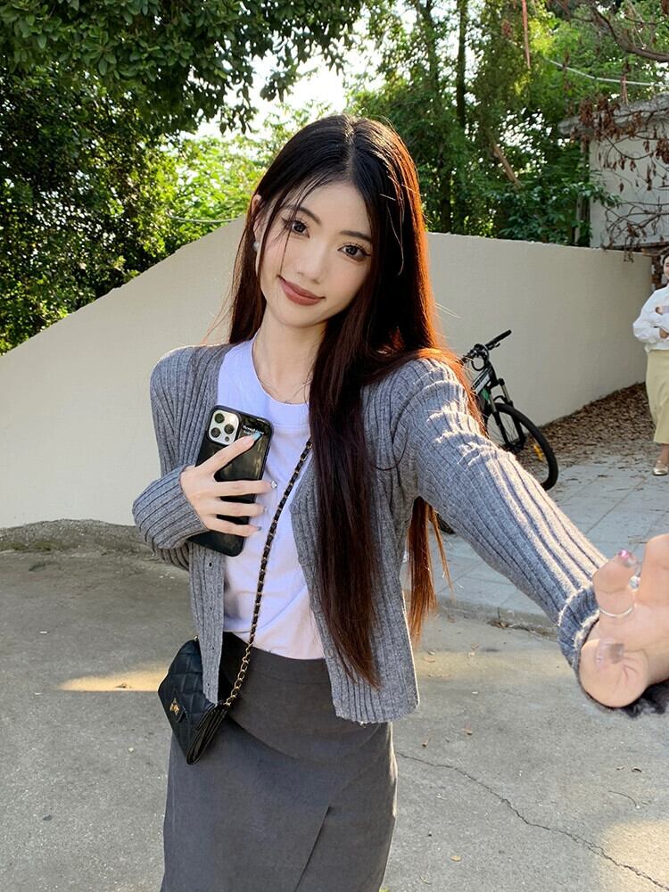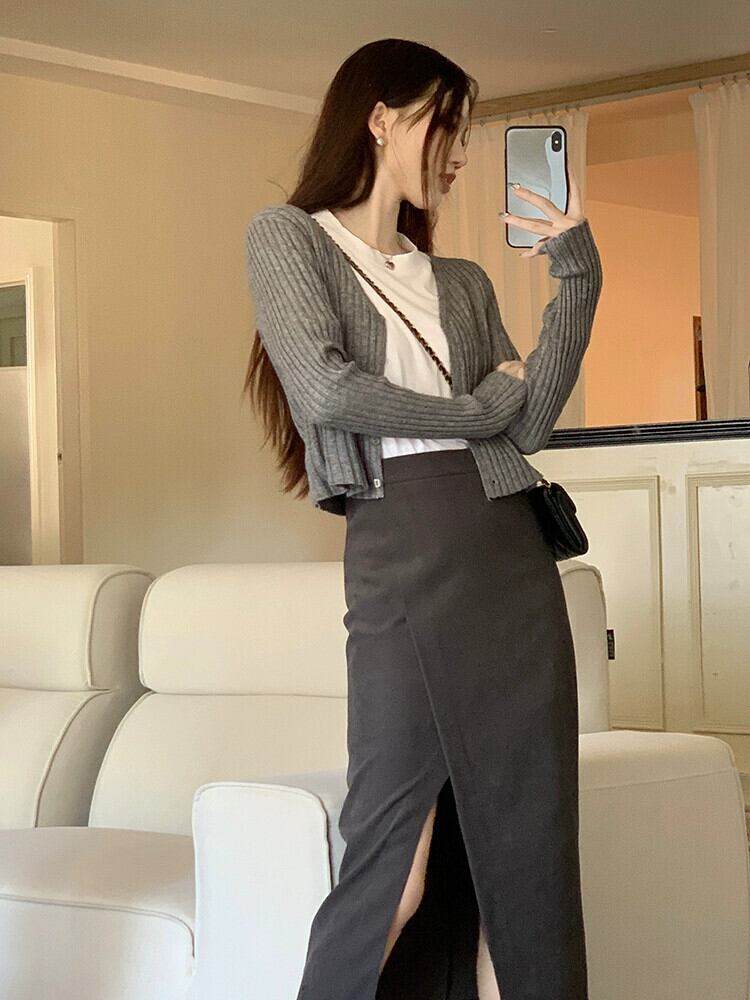 色:気質グレーのカーディガンセーター,白い綿のTシャツ,グレーのスカート,ブロガー募集オーダー