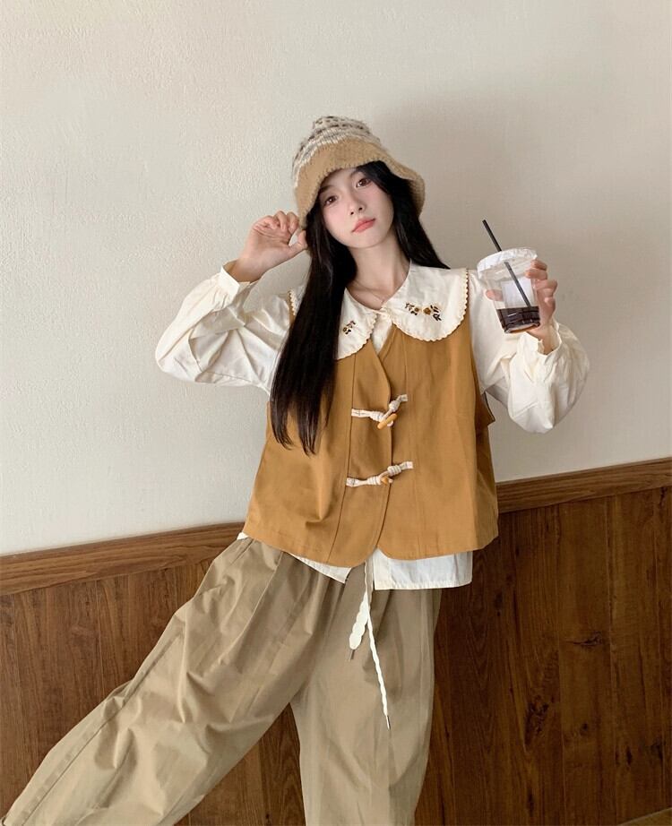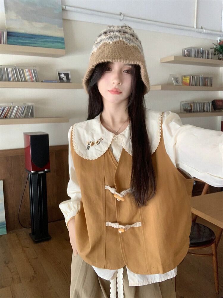 ホーンボタンベストベスト女性のシャツレイヤードチョッキ 2023 秋甘い ese スタイルノースリーブベスト レッド 大人ガーリー スウィート キュート カジュアル オータム 秋物 8571630367086180