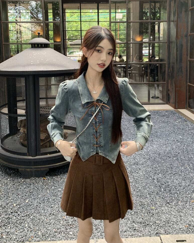 デニムシャツの女性のデザインニッチ 2023 初秋の新しい香港スタイルのレトロシックなシックなストラップショートトップ オータム 秋物 8571637322770640