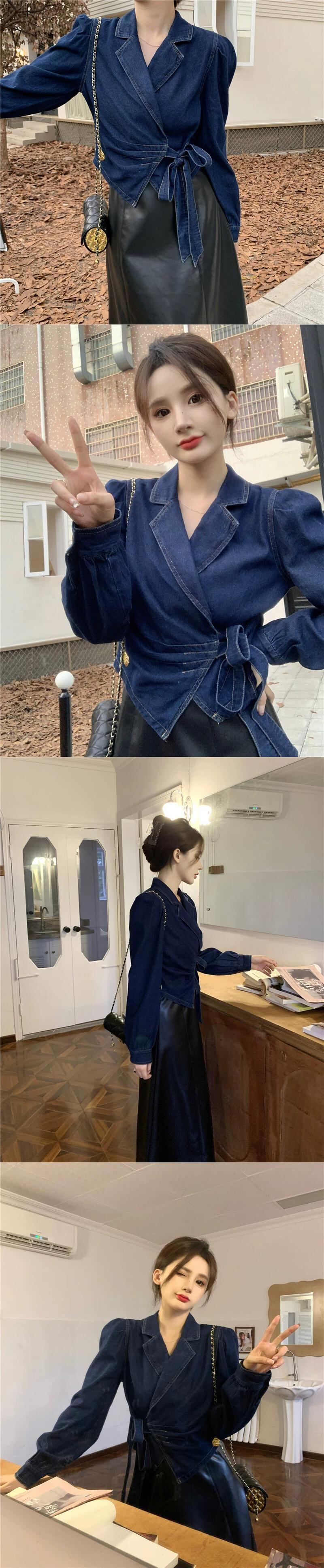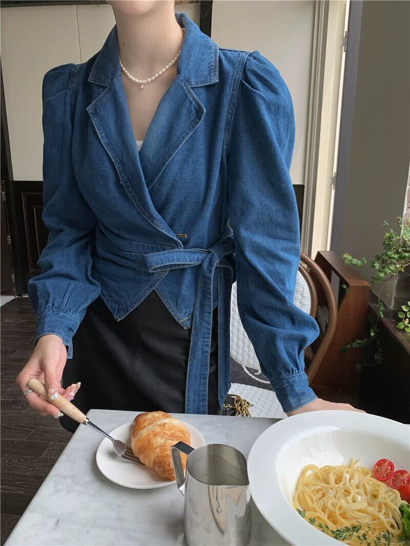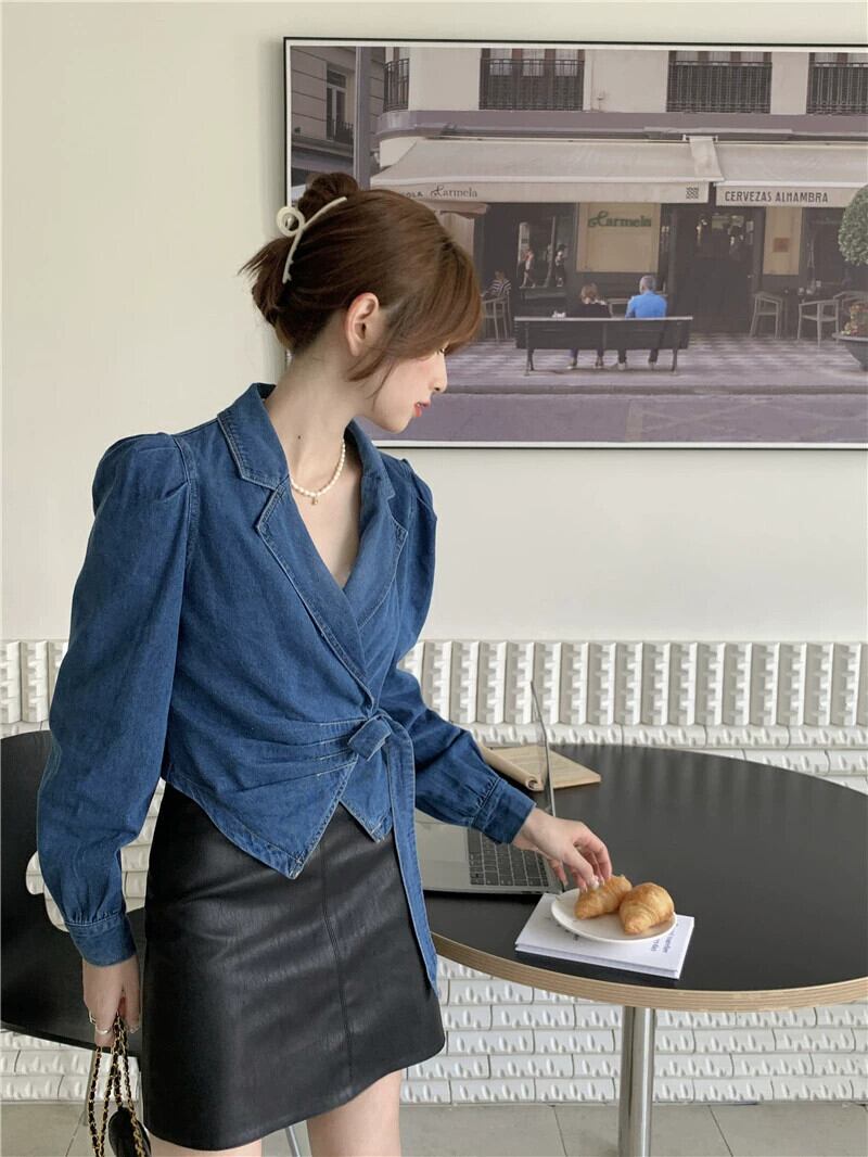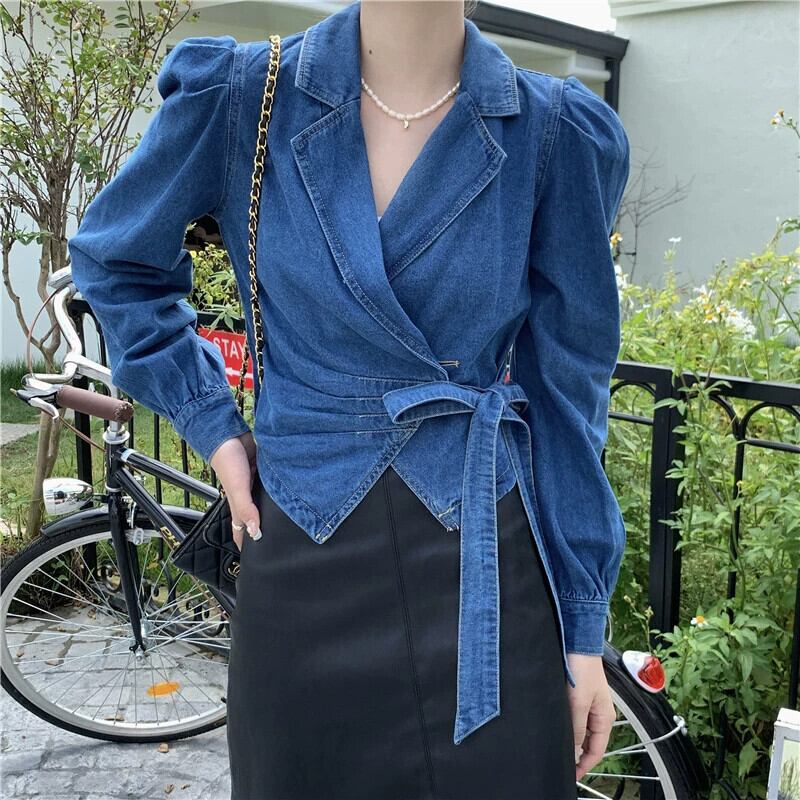 ライトブルーデニムシャツの女性 2023 秋の新作香港スタイルのハイエンド不規則なストラップトップ オータム 秋物 8571688465450470