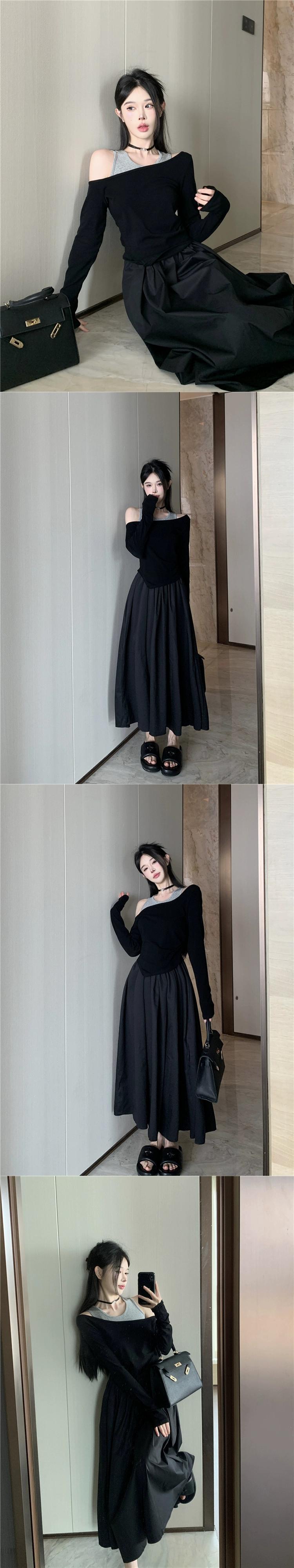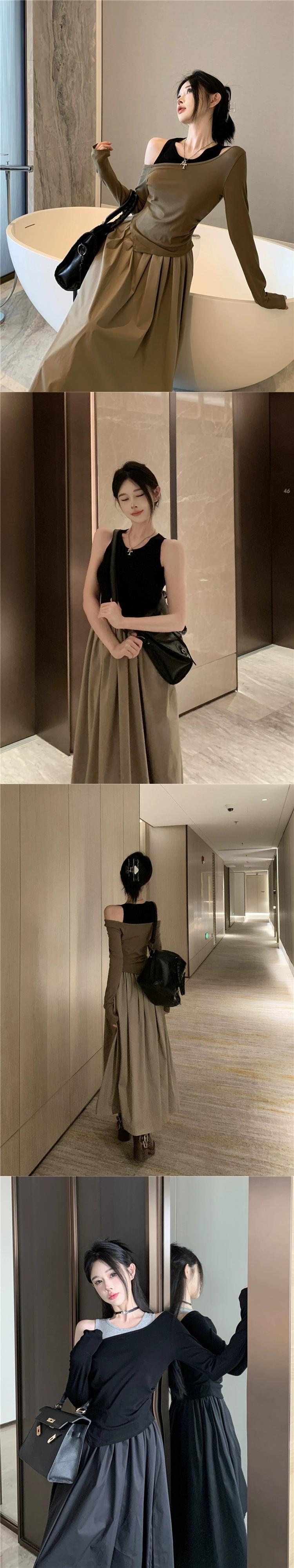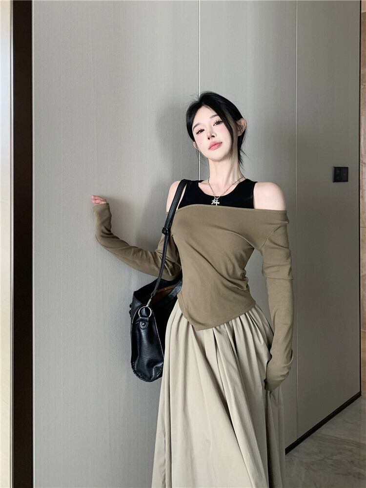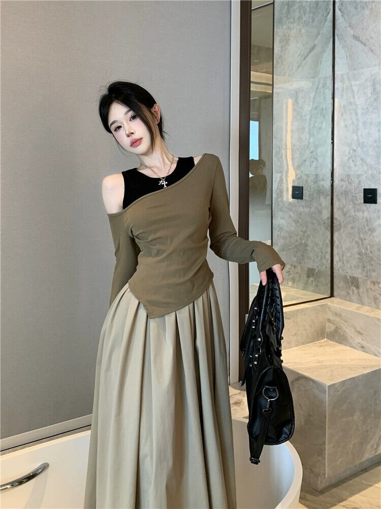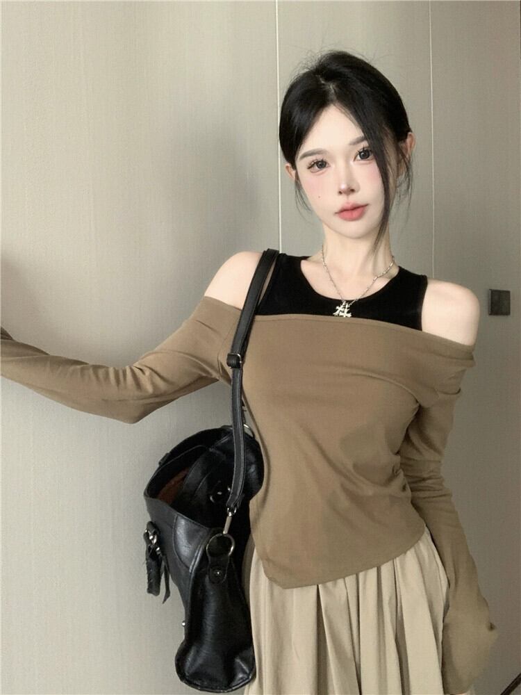 不規則なオフショルダートップスレディース、2023秋の新しいスタイル、クールでシックでユニークなコーヒーカラーの長袖Tシャツ2枚セット ロング オータム 秋物 8571698092848796