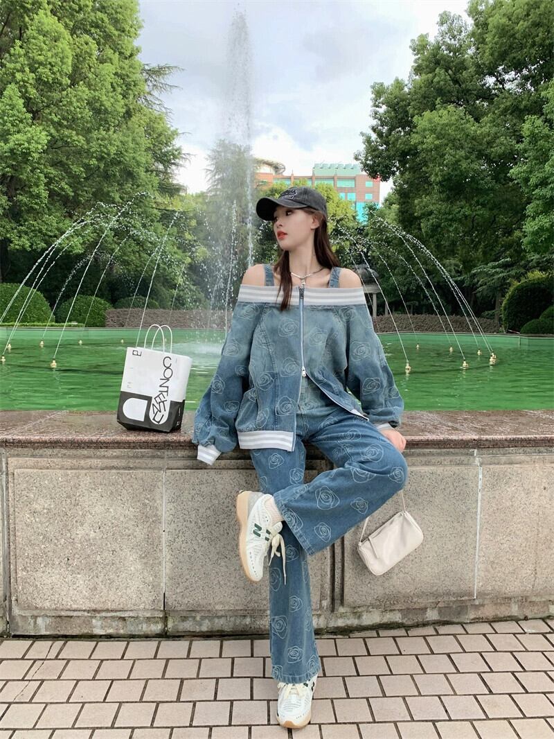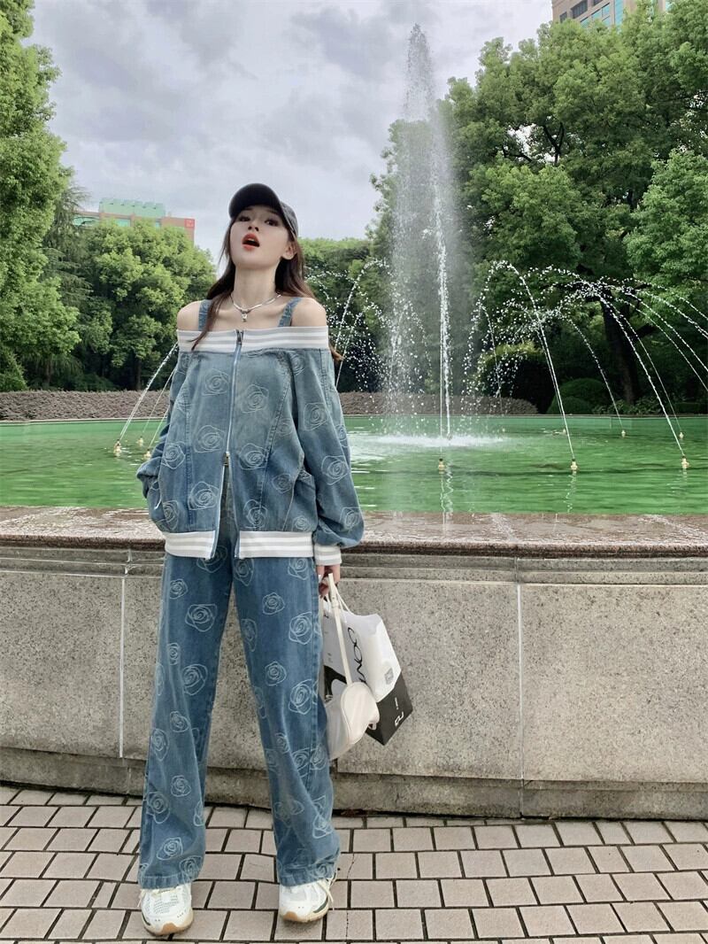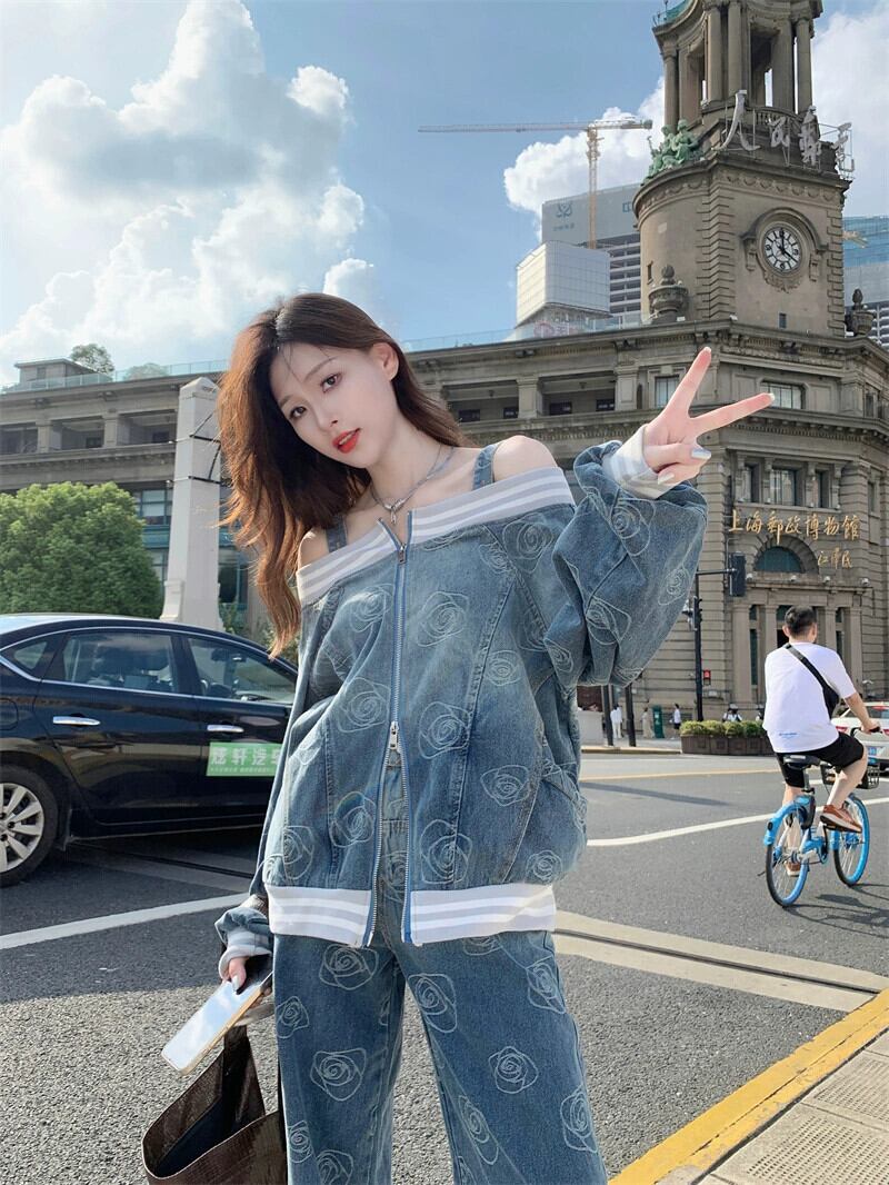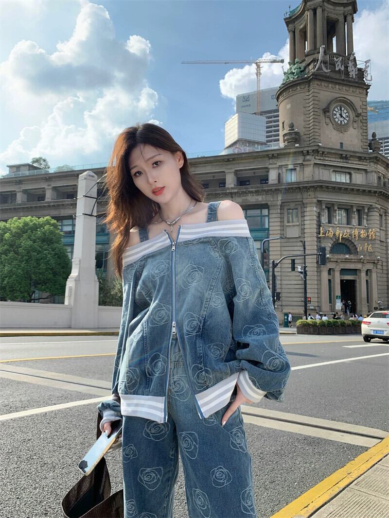 ワンショルダージャカードデニムジャケットレディース2023秋新作デザインニッチウエスタンスタイルトップ オータム 秋物 8571645153104311