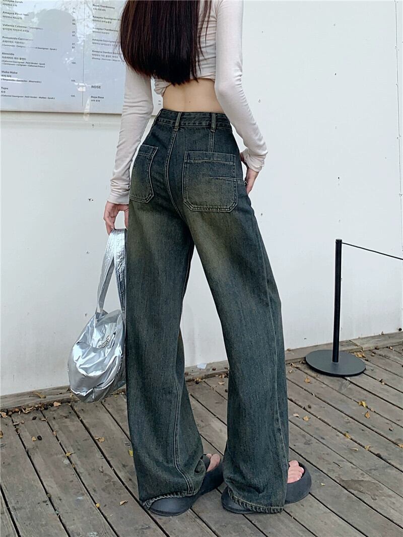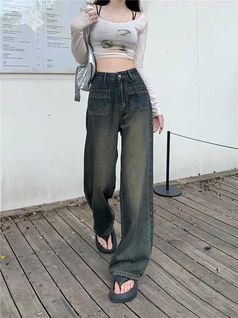 レトロウォッシュ加工ジーンズレディースルーズストレート2023秋新作ハイウエストスリムフロアレングスワイドレッグパンツ オータム 秋物 8571691267885050