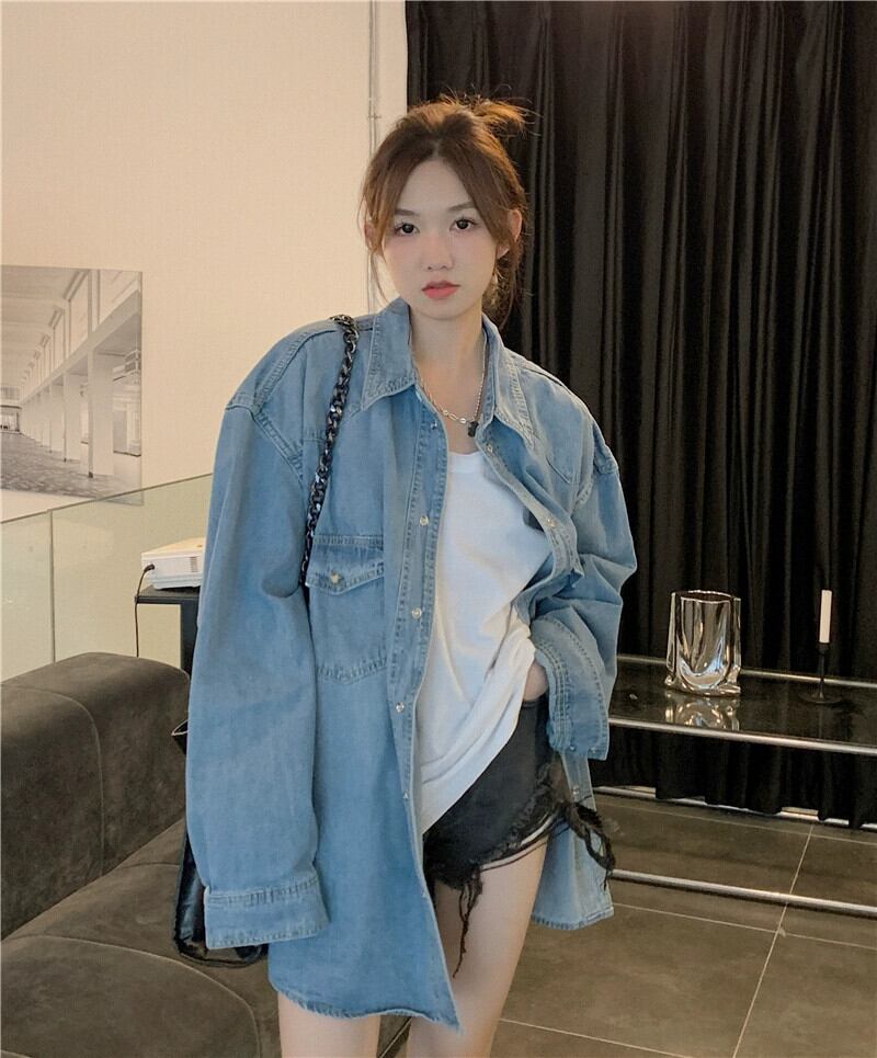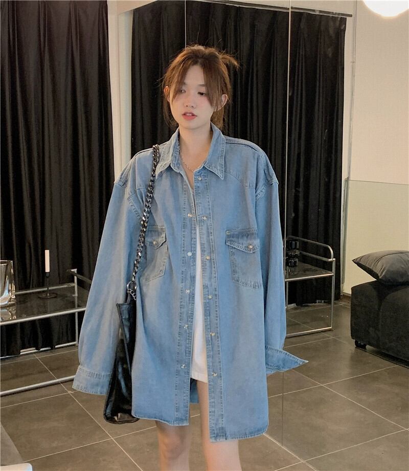 デニムシャツジャケットレディース 2023 秋の新ミドル丈シャツレトロルーズ BF 怠惰なスタイル長袖トップ ロング オータム 秋物 8571672478549154