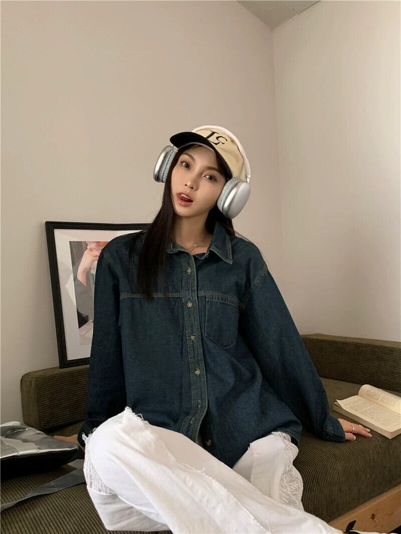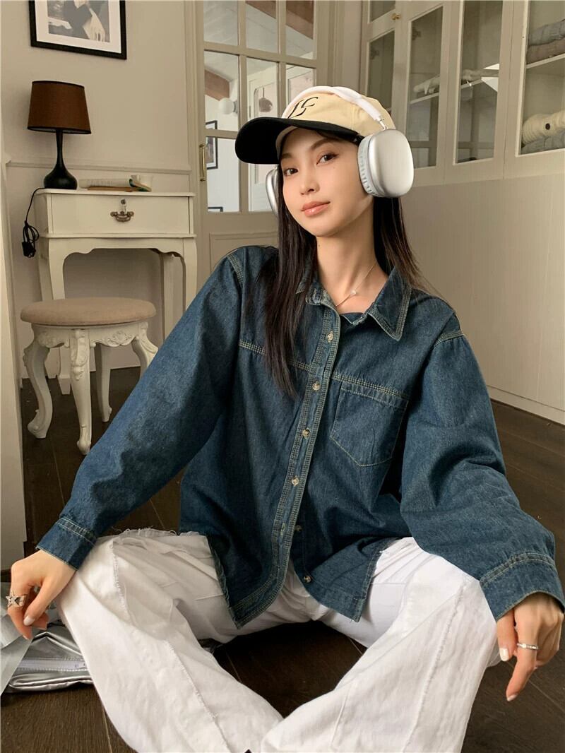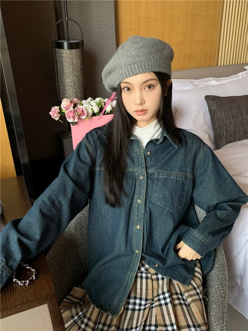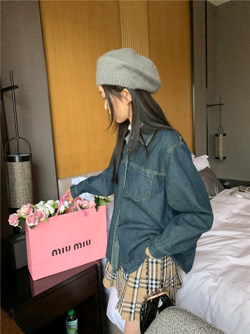 デニムシャツの女性の秋のレイヤードシャツ 2023 新しい香港スタイルのレトロシックなルーズ長袖トップ ロング レッド オータム 秋物 8571662522265724