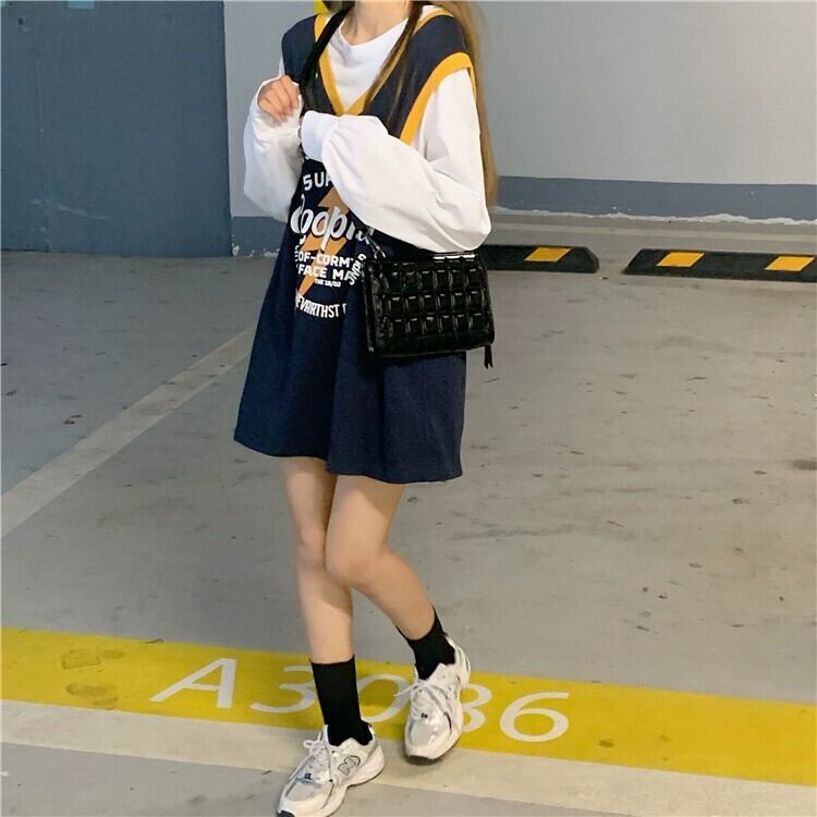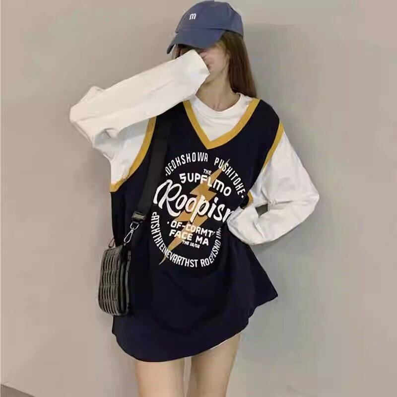 偽ツーピース長袖 Tシャツ女性 2023 初秋の新しいバスケットボールジャージアメリカンレトロミッドレングスお尻カバートップトレンディ ロング オータム 秋物 8571678132062254