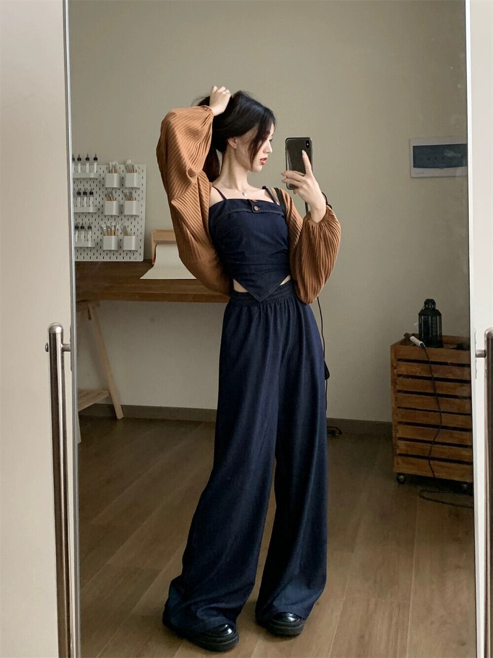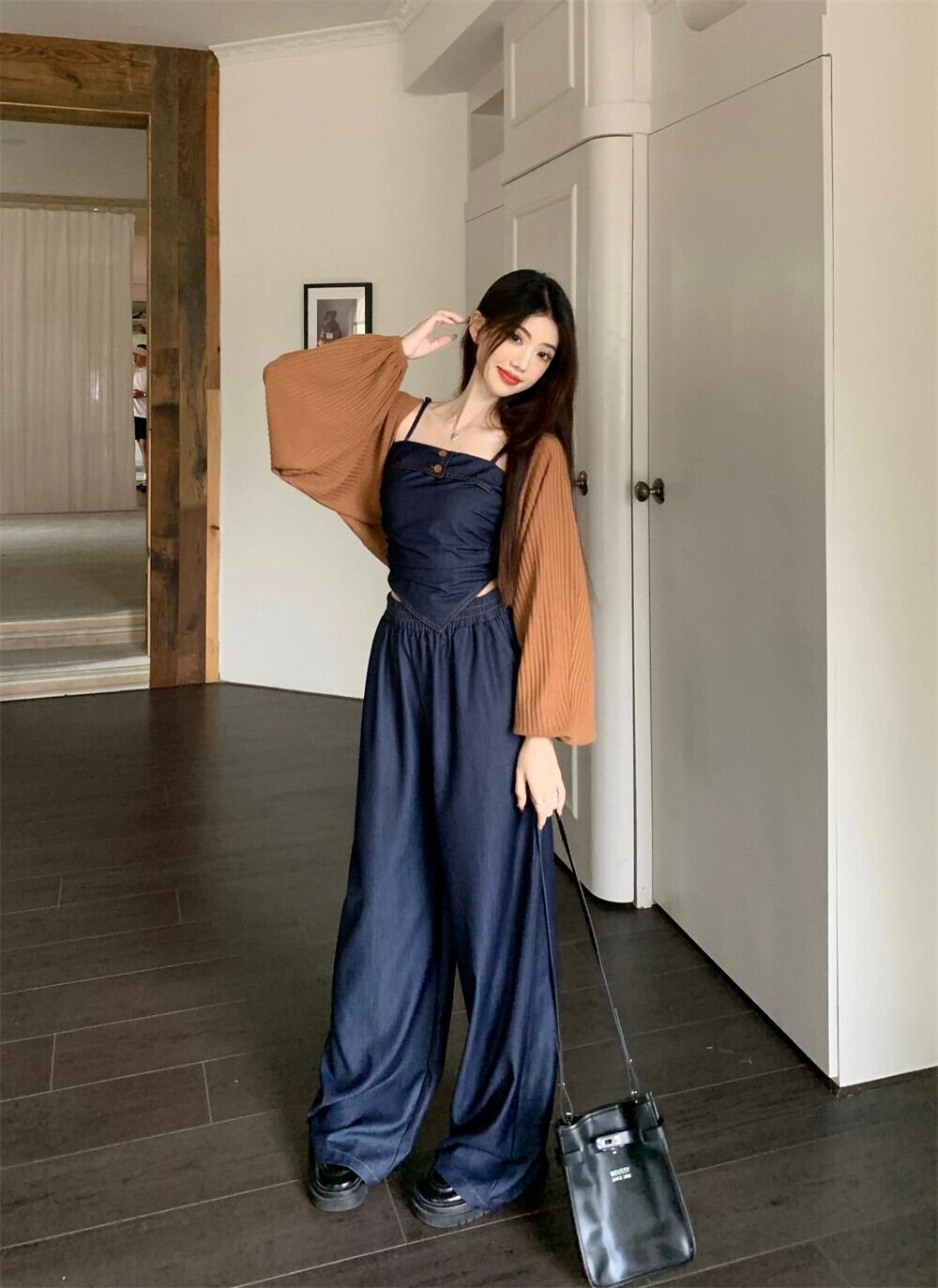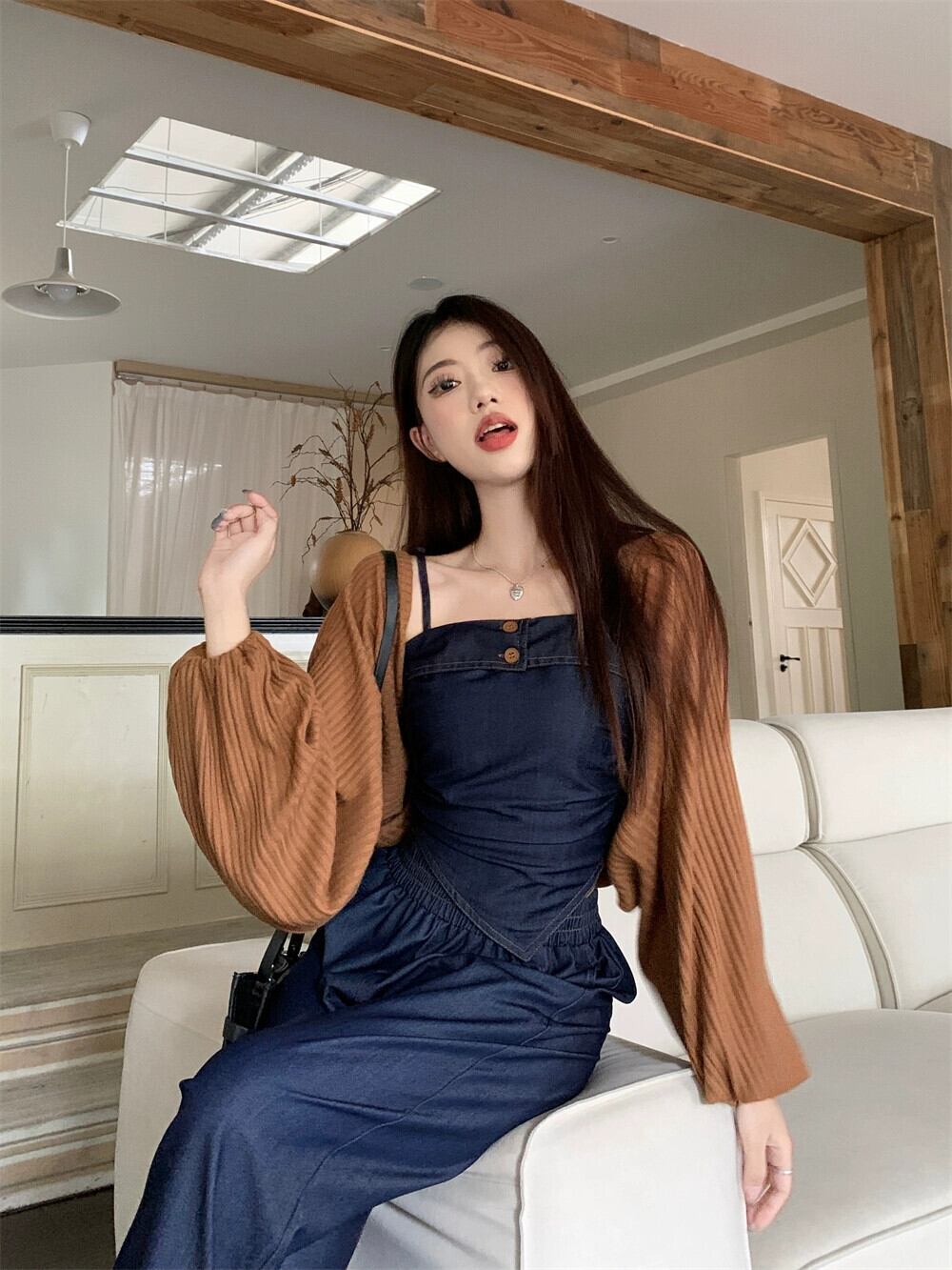 色:コーヒー色のカーディガン,デニムブルーサスペンダー,デニムブルーパンツ,ブロガー募集オーダー