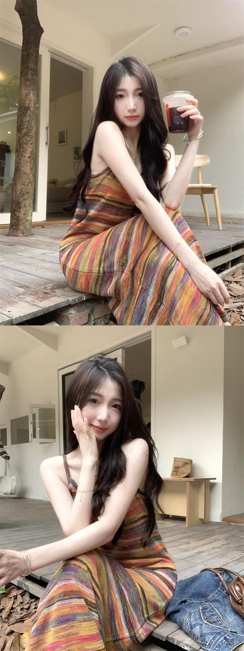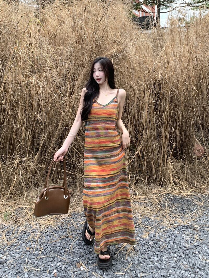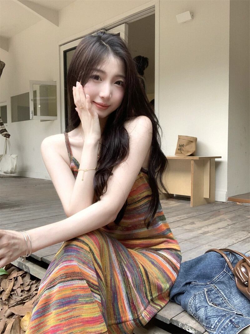 レインボーストライプサスペンダードレス女性 2023 秋の新スタイルレトロ優しいドレープインナーボトロングスカート オータム 秋物 8571642388977287