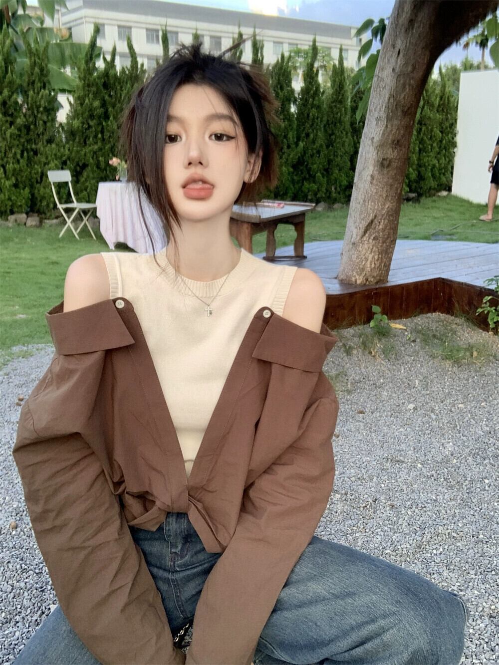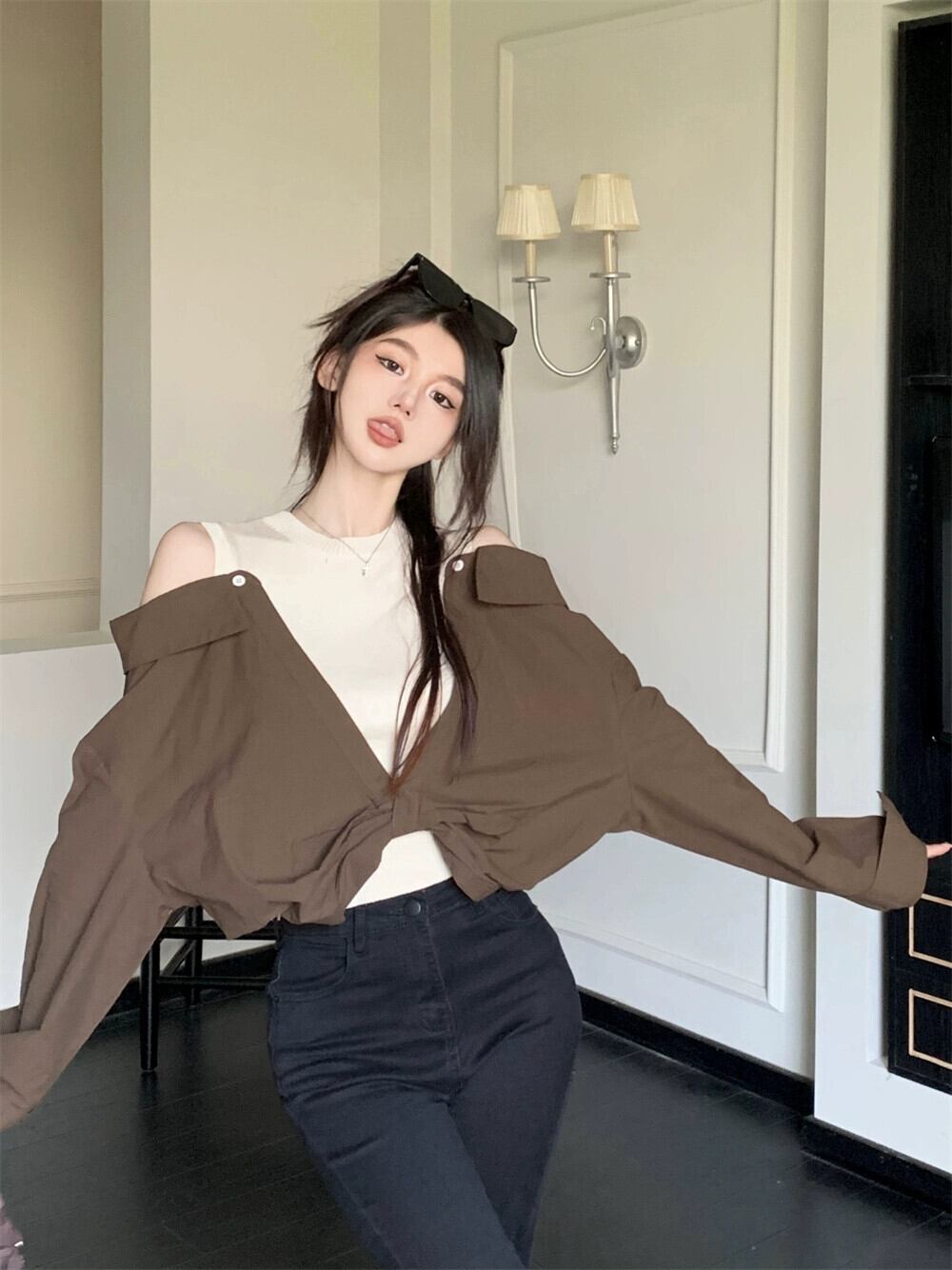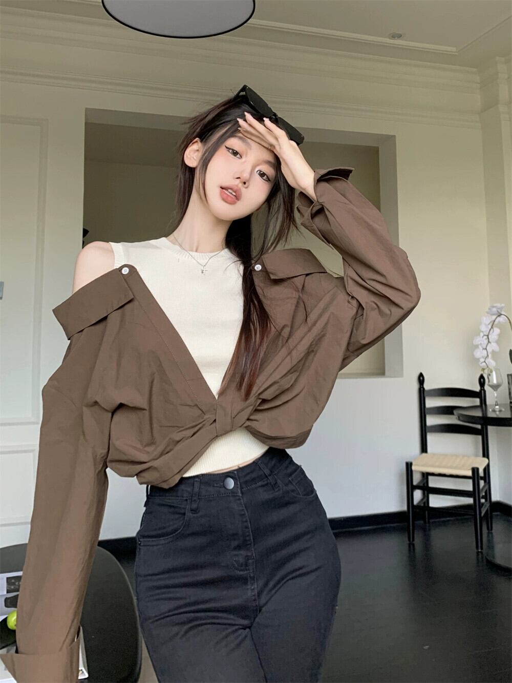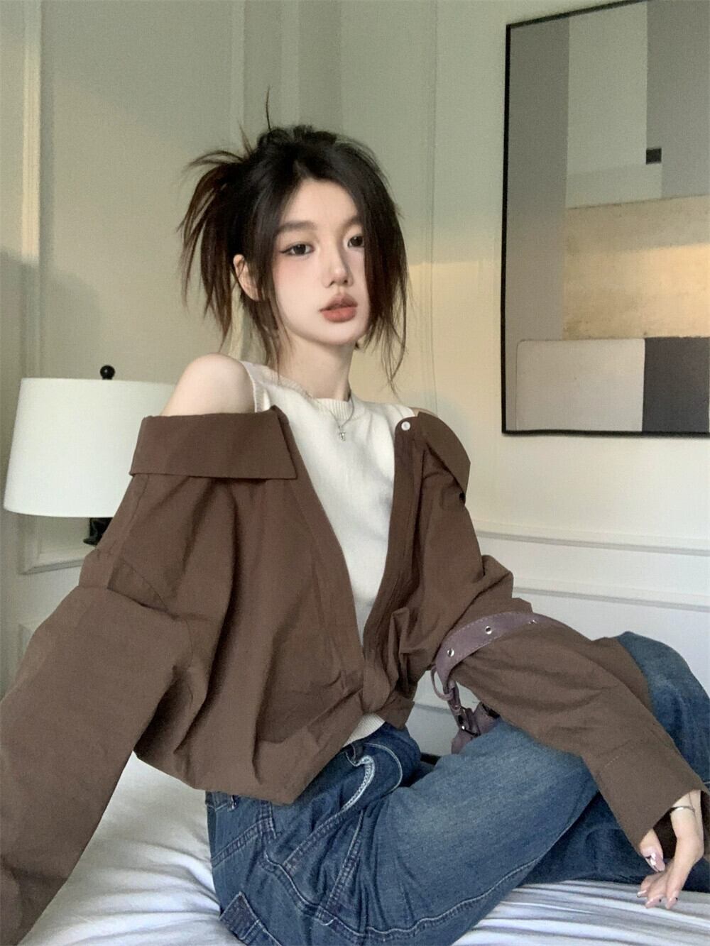 フェイクツーピースオフショルダートップレディースデザインニッチ2023初秋の新しい香港スタイルのレトロなカラーブロッキング長袖シャツ ロング オータム 秋物 8571646891796840