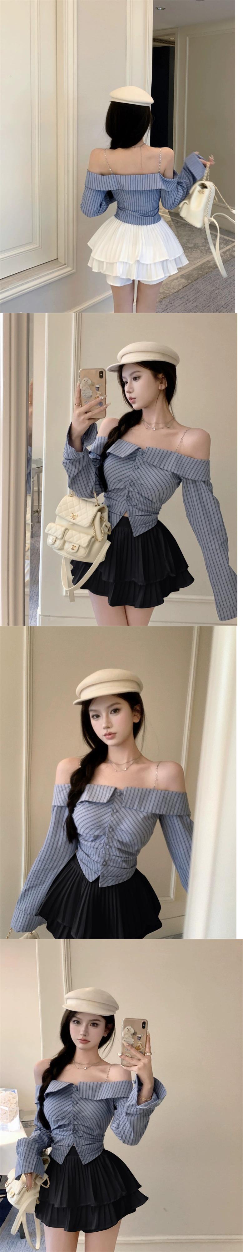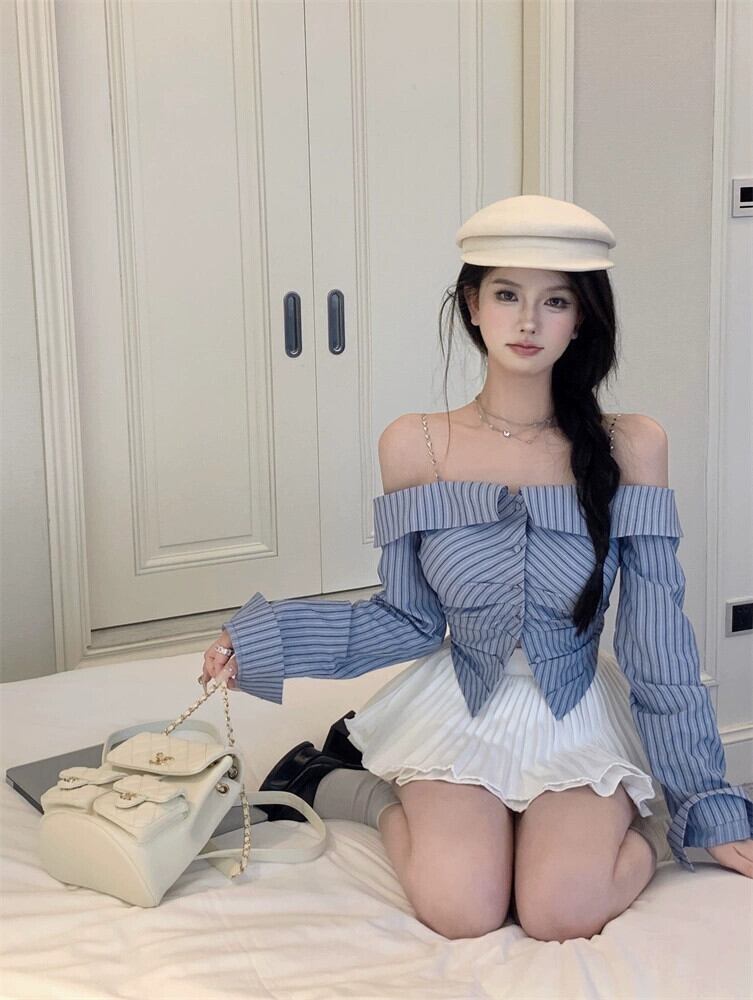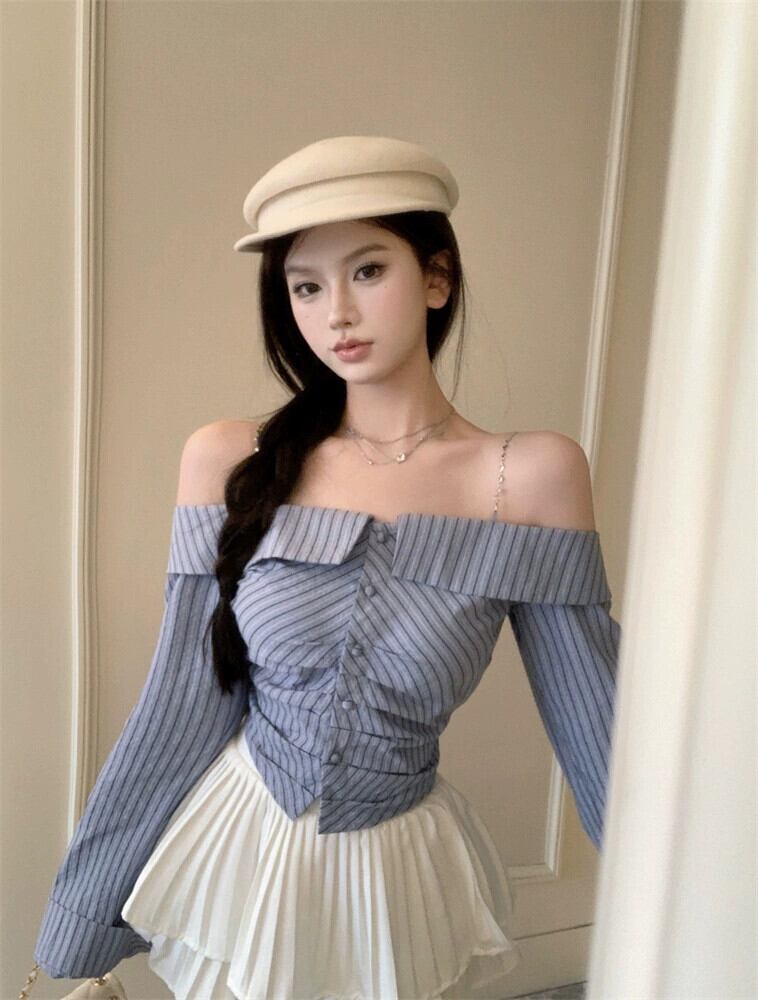 ワンショルダーウエスト締め付けトップ女性 2023 初秋の新しい純粋な欲望シックな長袖ストライプシャツ ロング オータム 秋物 ピュア 857169614770599