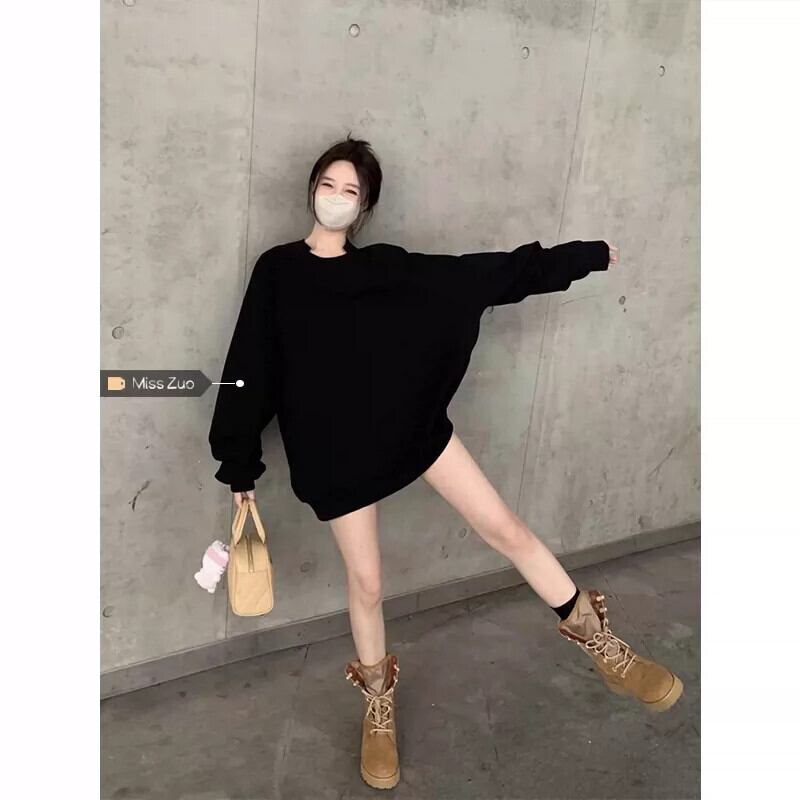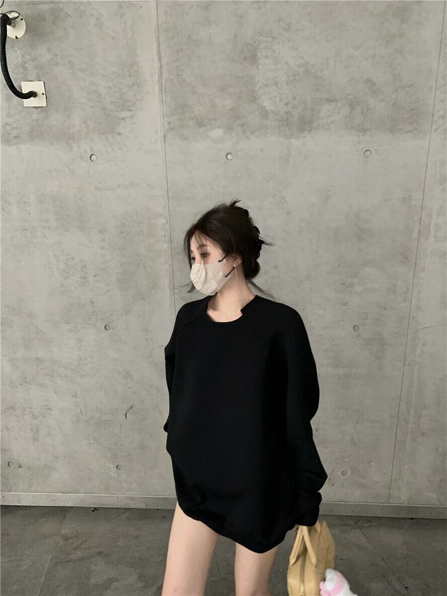 黒ラウンドネックスウェットシャツ女性の秋 2023 新作ルーズカジュアル怠惰な BF スタイルオーバーサイズ長袖トップ ロング ブラック オータム 秋物 Oネック 8571638685649147