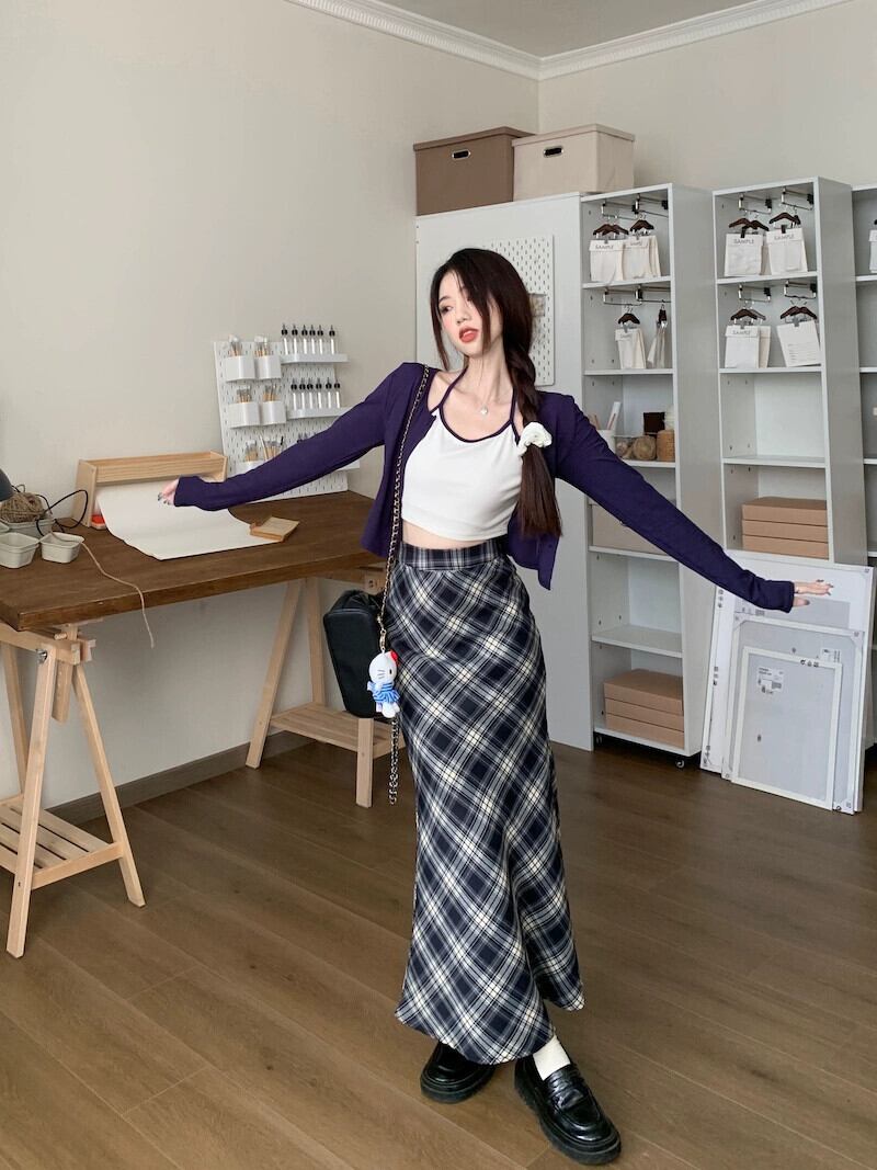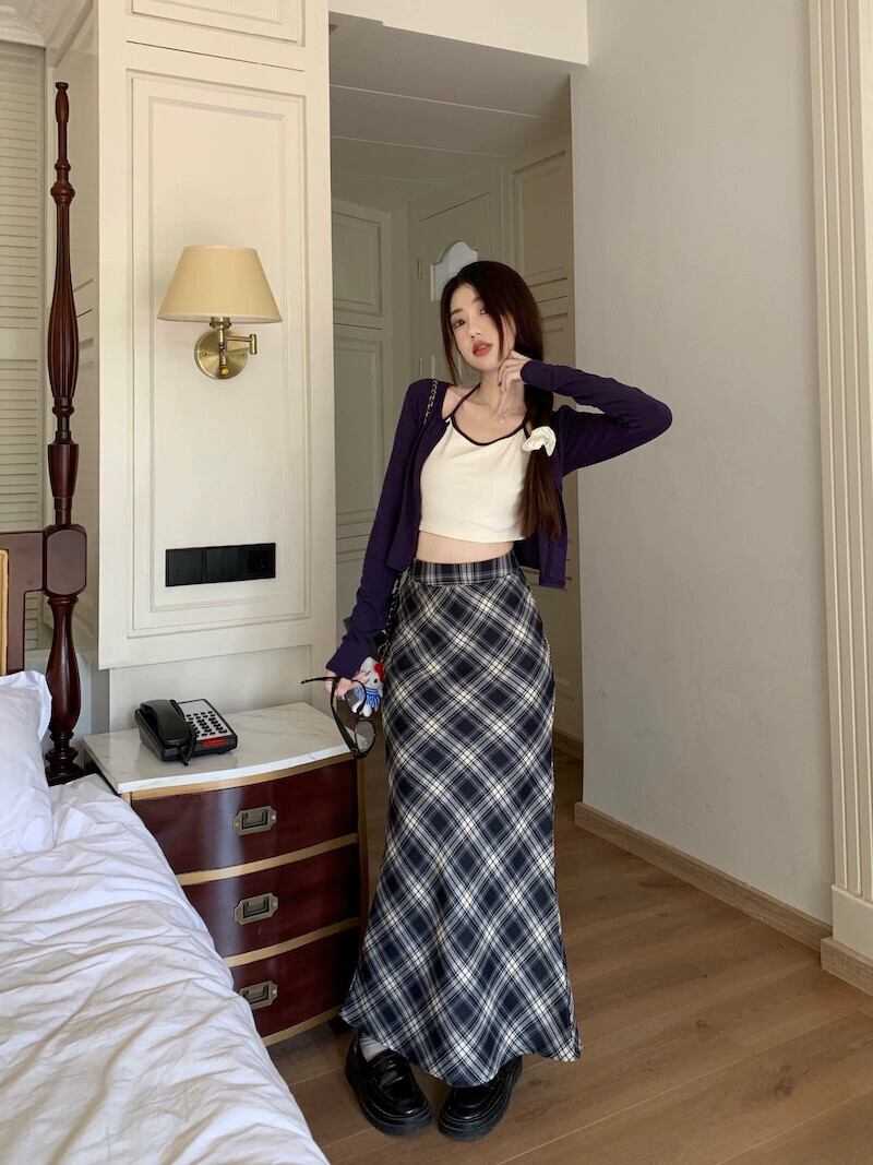レトロチェック柄スカート女性のウエスト A ラインフィッシュテールスカート秋 2023 スタイルスリムヒップカバーロングスカート オータム 秋物 Aライン 8571674873268355