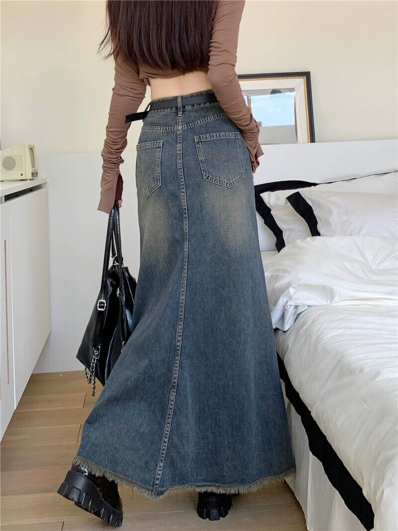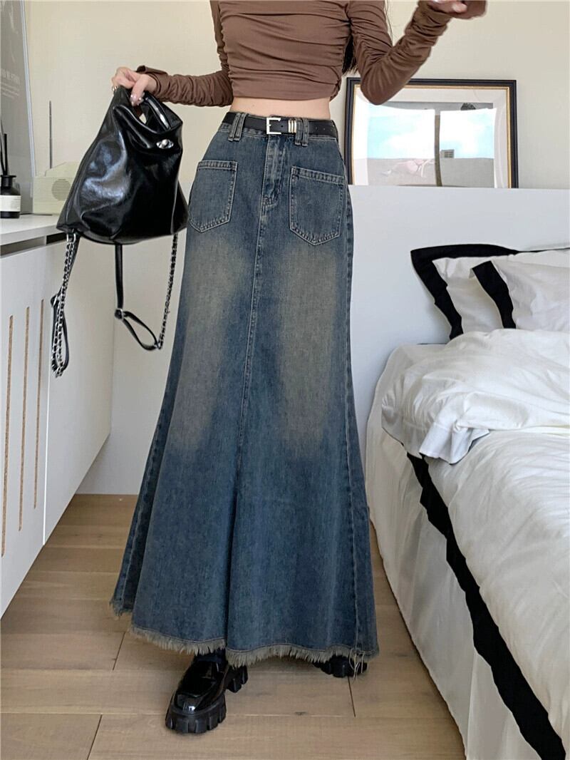 ローエッジフィッシュテールスカートデニムスカートレディース秋ハイウエスト A ラインスカート 2023 新しいミドル丈ヒップカバーロングスカート オータム 秋物 Aライン 8571690371314774