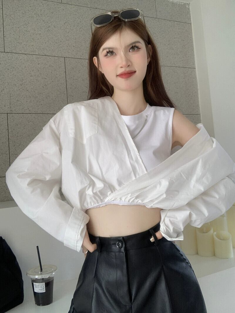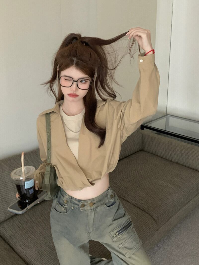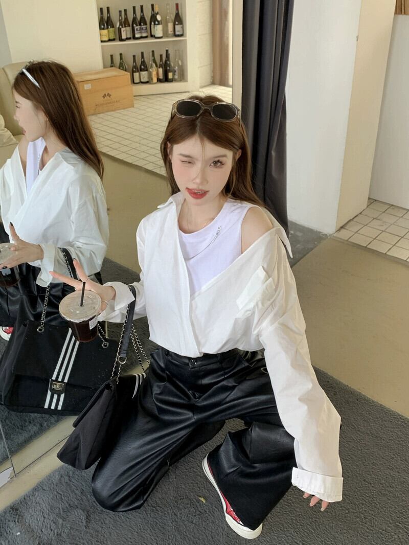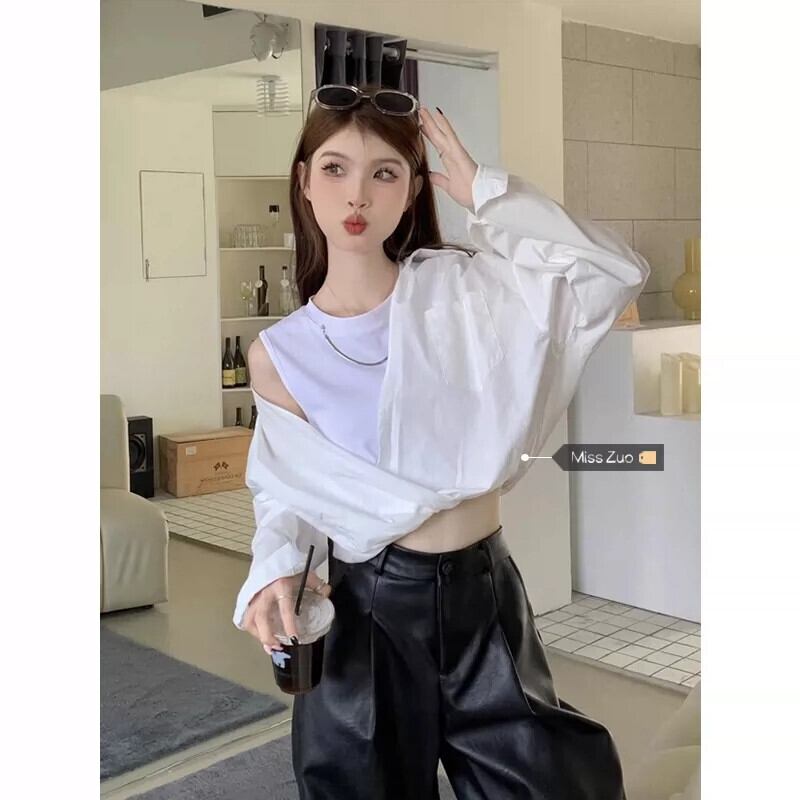 偽ツーピースショートトップ女性初秋の新デザインファッショナブルなレトロな小さな白い長袖シャツ ロング ホワイト オータム 秋物 8571646501775569