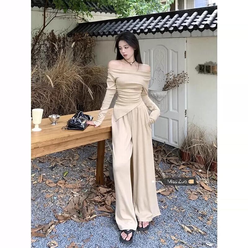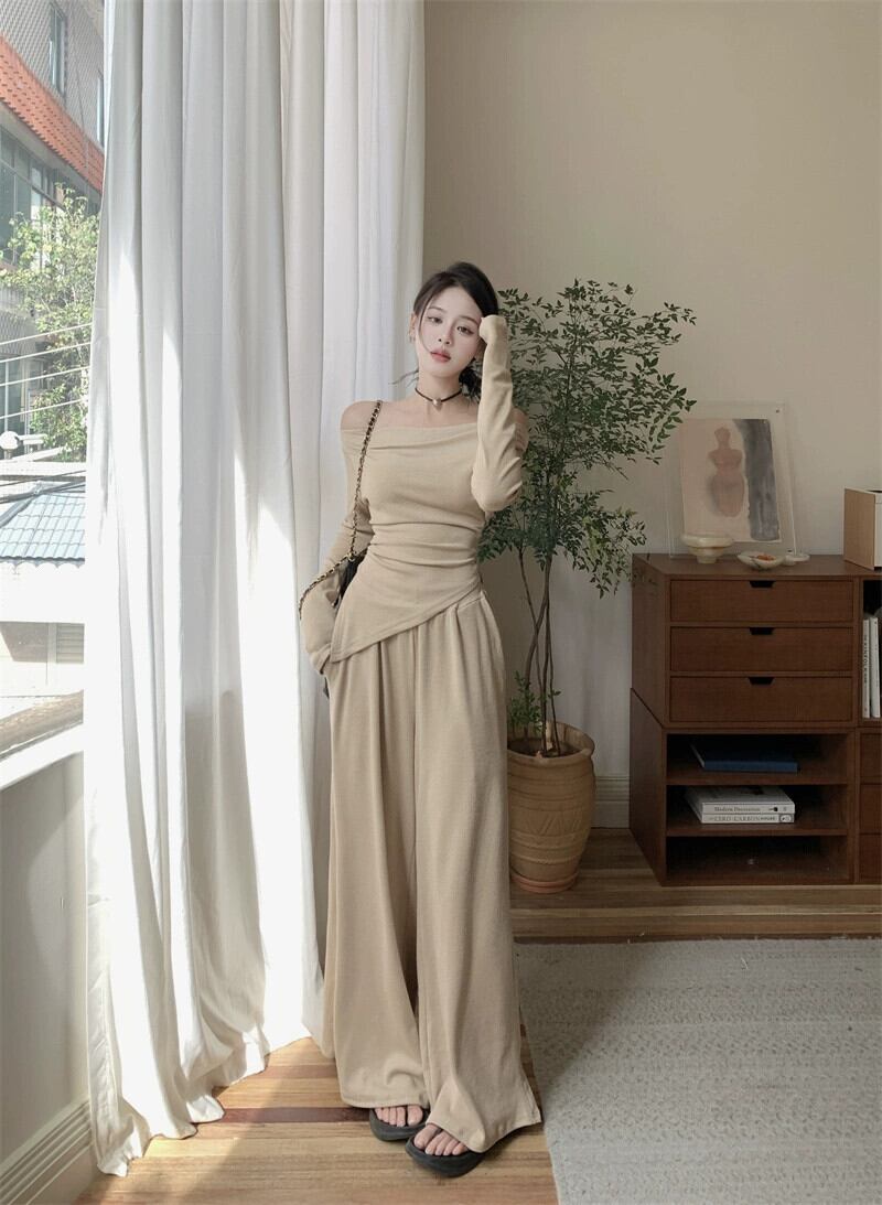 秋のワンショルダースリムフィットトップスレディース、クールなスタイル、ユニークでユニークな不規則なボトム長袖Tシャツツーピーススーツ ロング オータム 秋物 8571669603651675