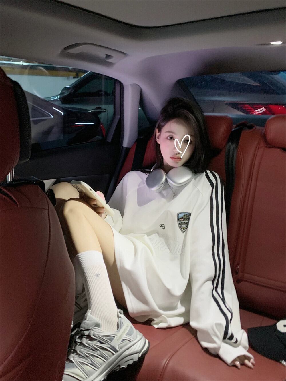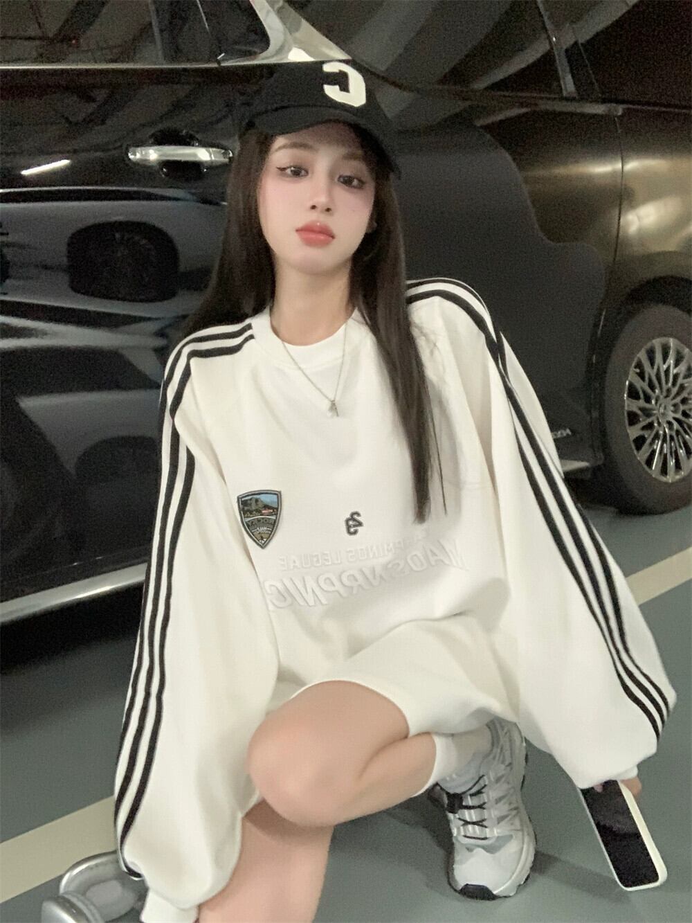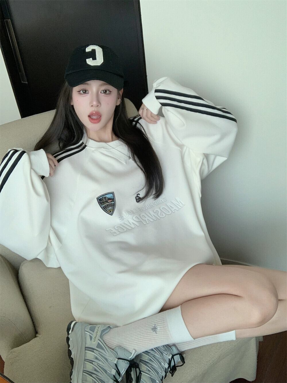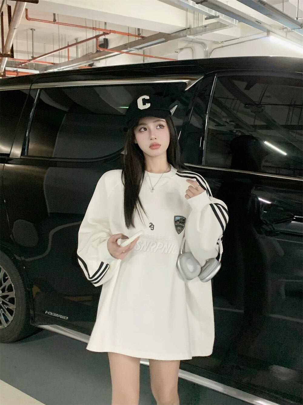 ホワイトラウンドネックトレーナー女性 2023 秋の新スタイルアメリカンレトロトレンディなブランド怠惰なスタイルのミッドレングス長袖トップ ロング オータム 秋物 Oネック 857164393358886