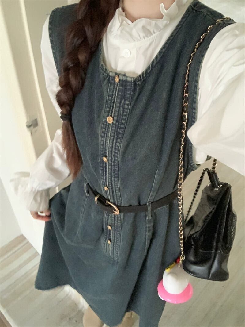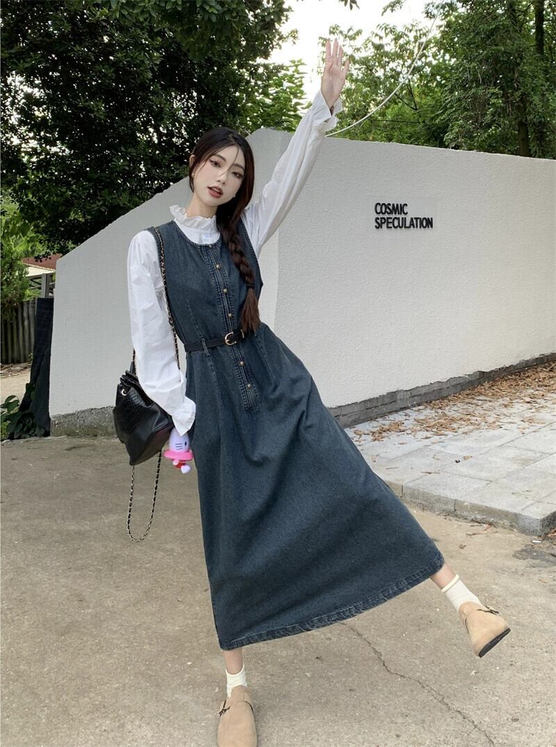 デニムベストドレス女性の 2023 秋香港スタイルのレトロな気質-エンドスーパーホットウエストロングスカート オータム 秋物 857167888856960