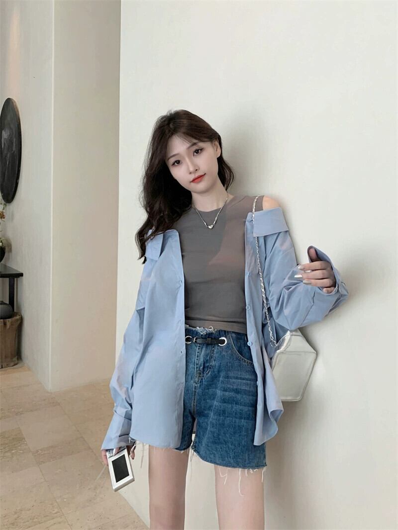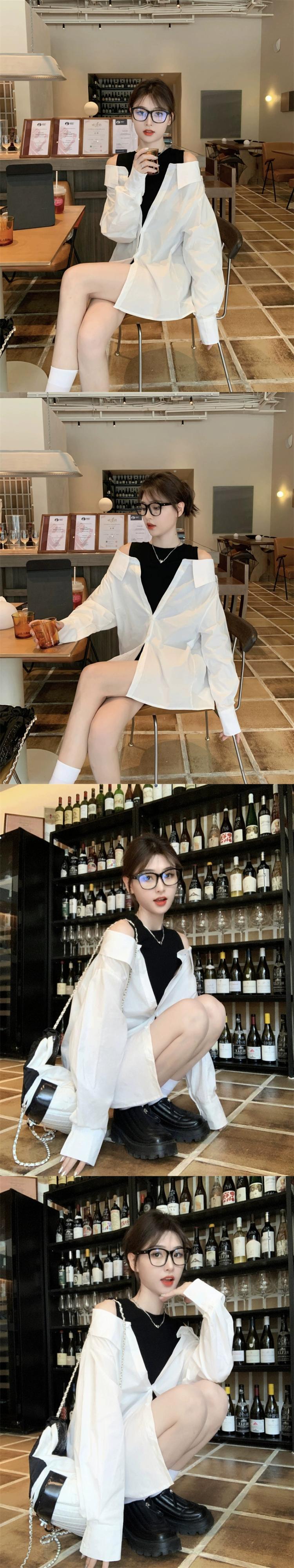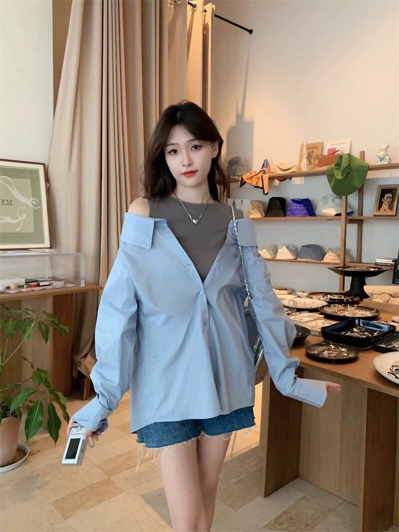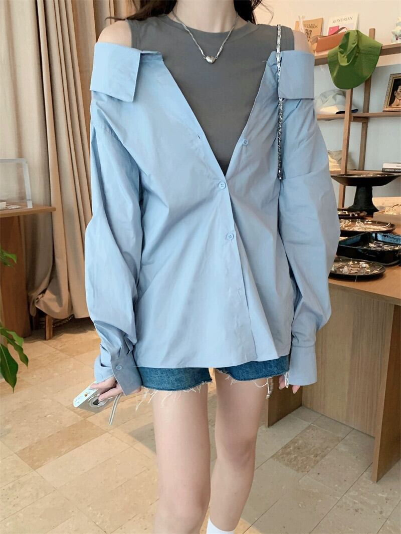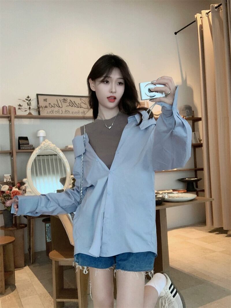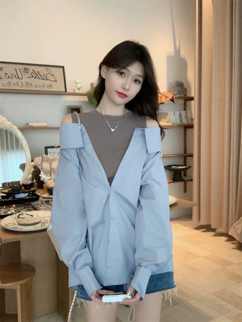 フェイクツーピースオフショルダートップレディースデザインニッチ2023初秋の新ファッションファッショナブルなカラーブロック長袖シャツ ロング オータム 秋物 8571616981405809