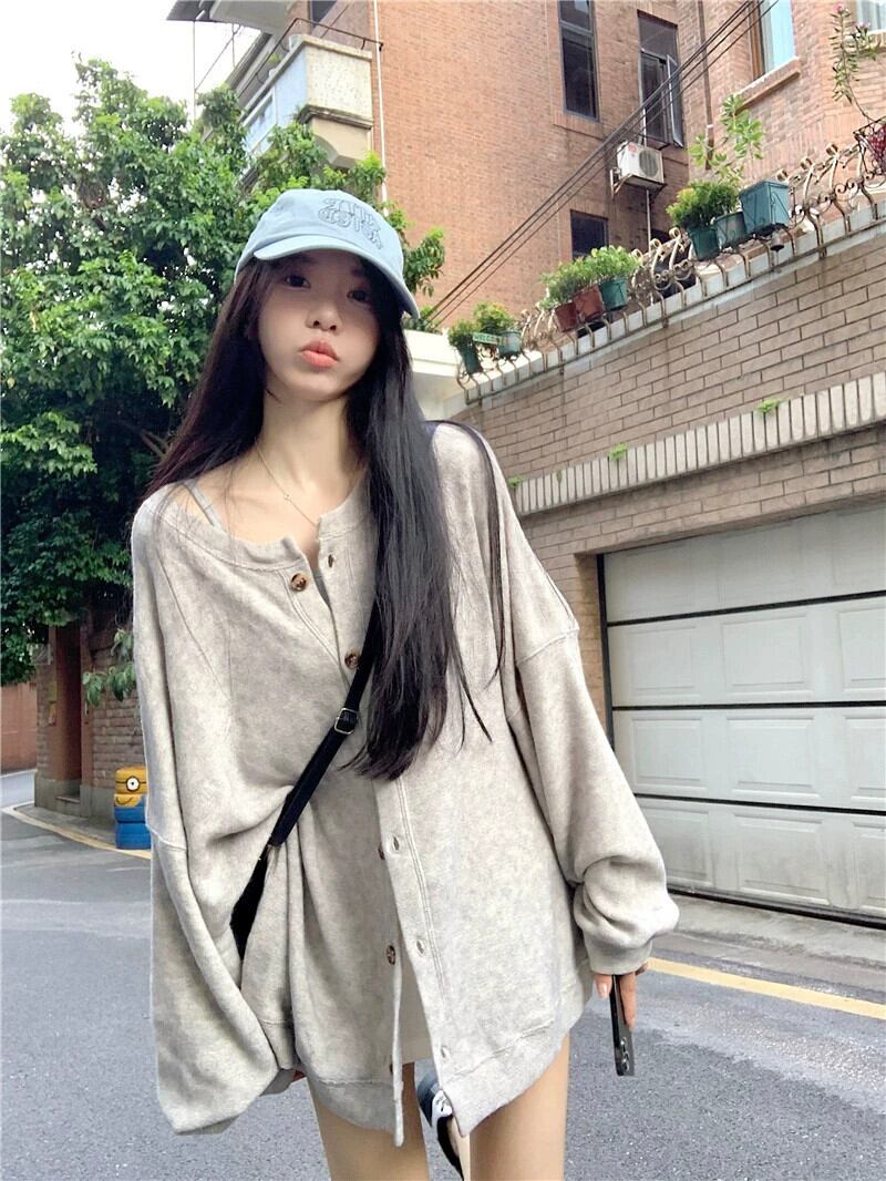 グレースウェットシャツカーディガンジャケット女性の2023初秋の新しい緩い怠惰なスタイルカジュアルミッドレングス長袖トップ ロング オータム 秋物 8571667545192817