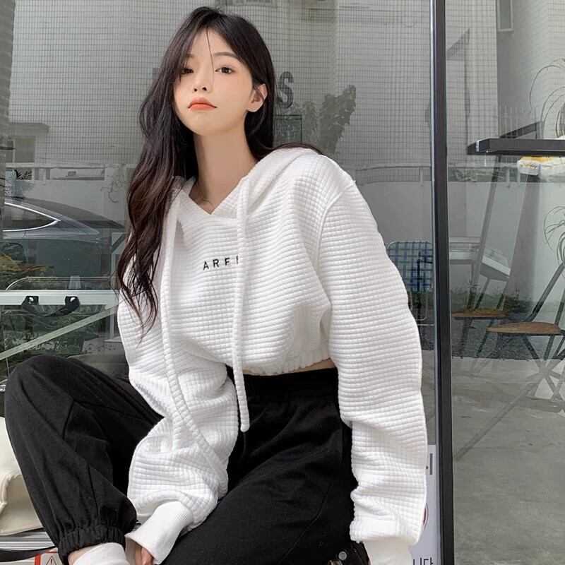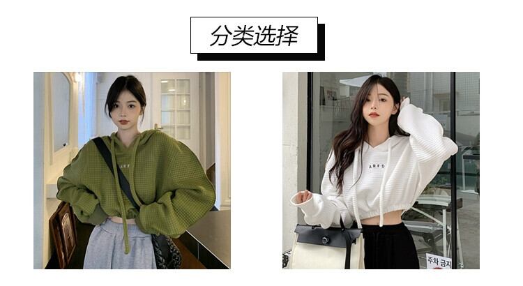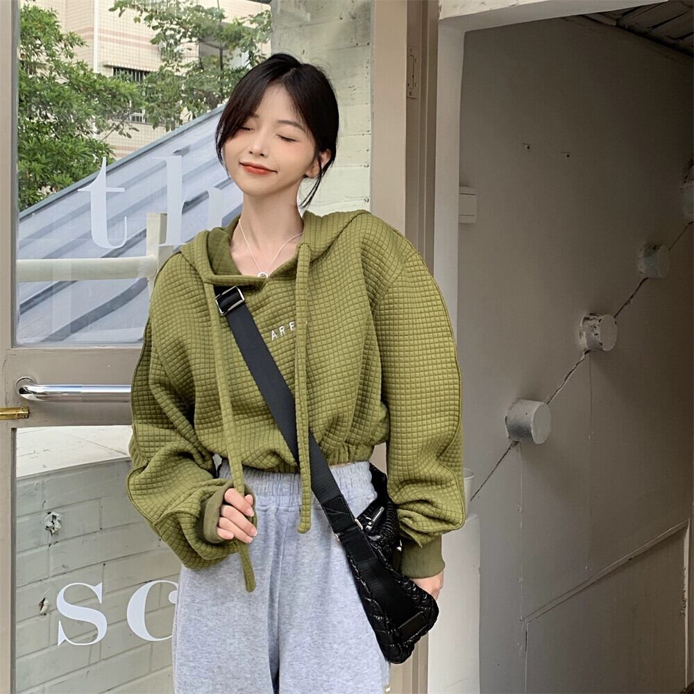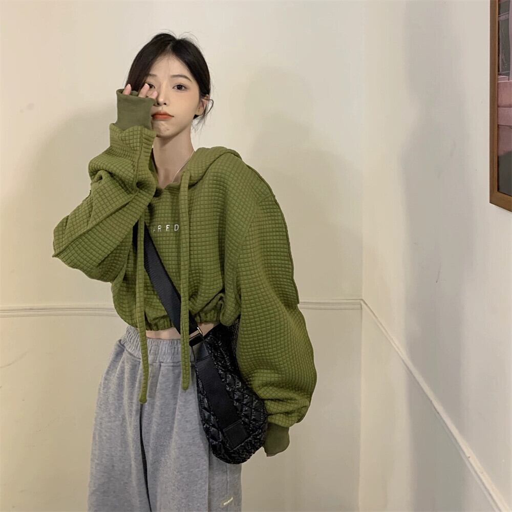 アーミーグリーン フード付きスウェットシャツ レディース S 2023 初秋 アメリカン スタイル レイジー シック ショート トップス オータム 秋物 8571641099061078