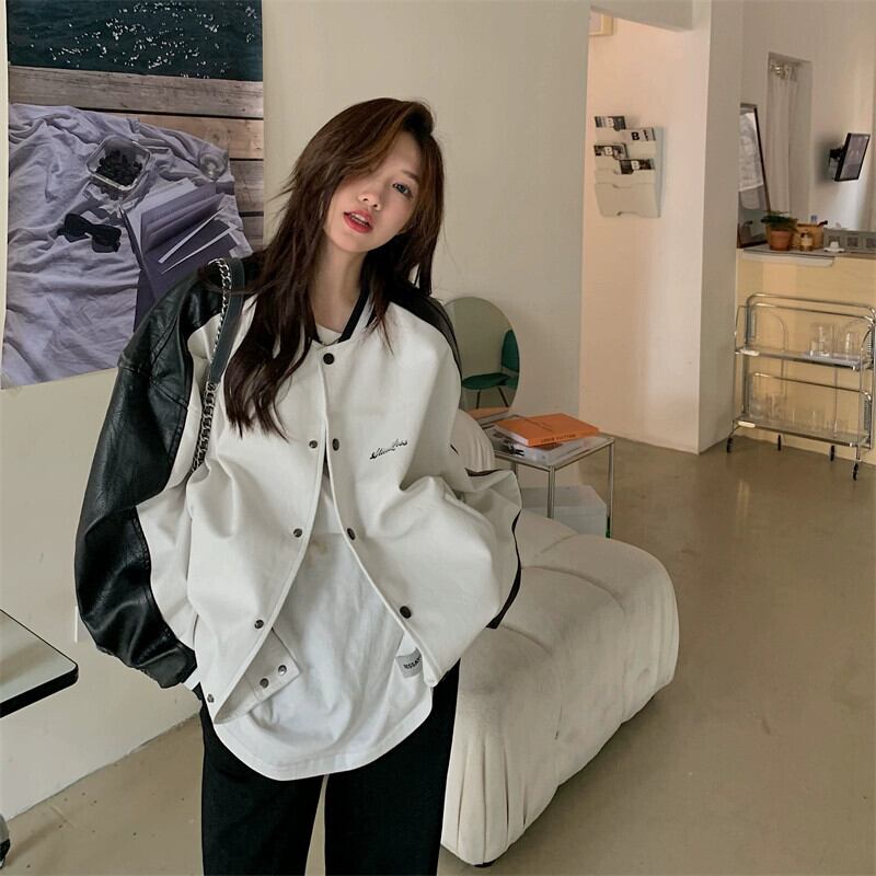 カラーブロック PU レザージャケットの女性の 2023 秋の新しい人気スタイルアメリカンレトロファッションブランド野球ジャケット オータム 秋物 8571658116472582
