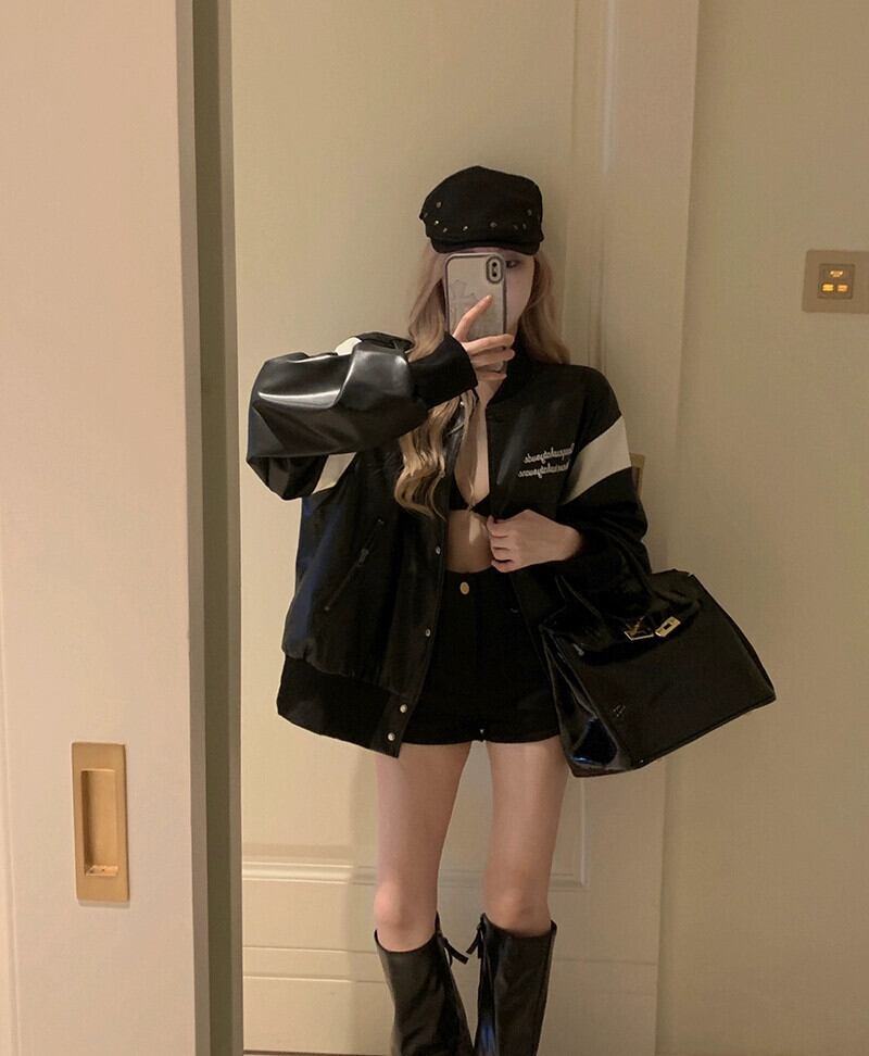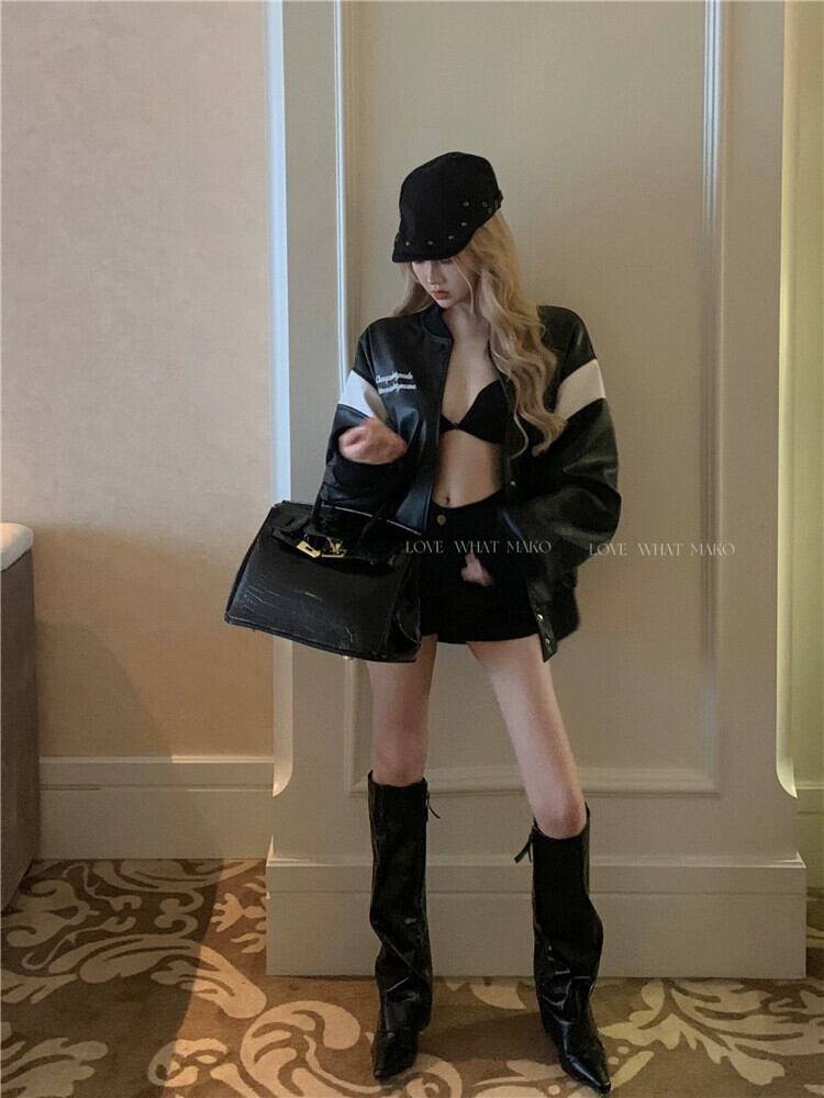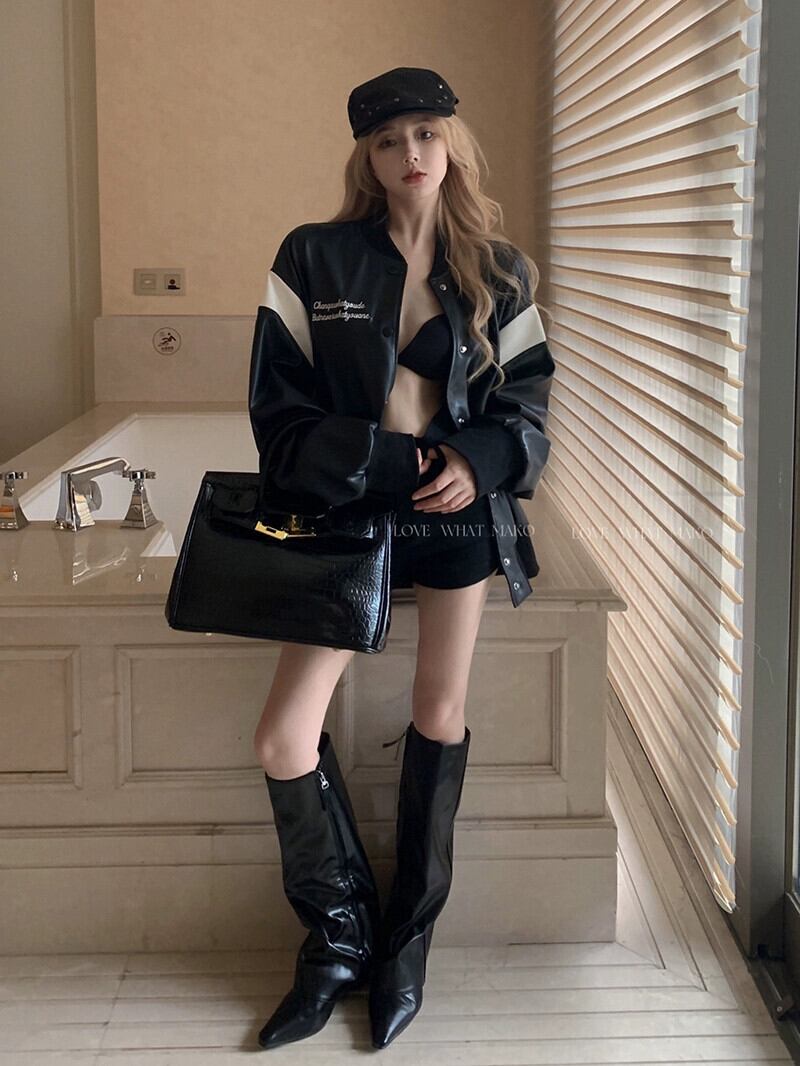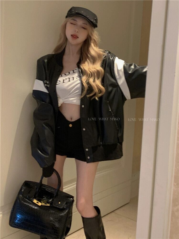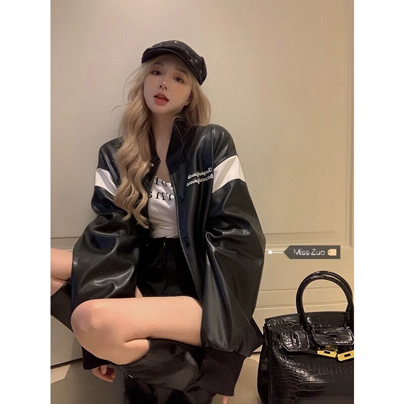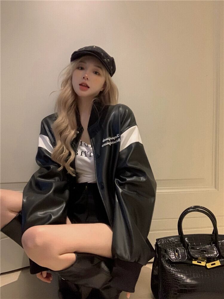 コントラストカラー野球ユニムレザージャケットレディース秋 2023 新しいアメリカンレトロ甘いクールなハイストリートジャケットトレンド 大人ガーリー スウィート キュート カジュアル オータム 秋物 8571674536401295