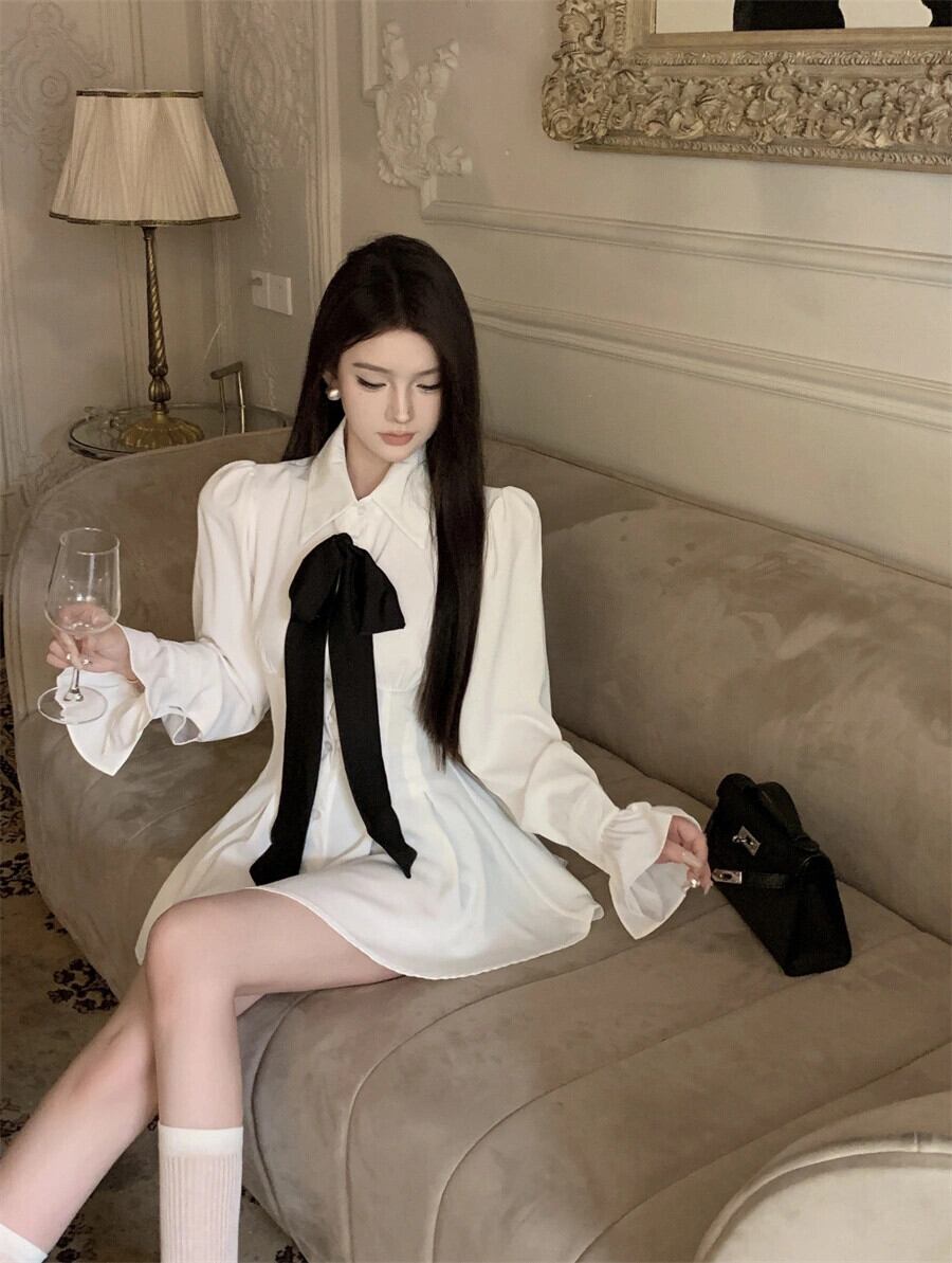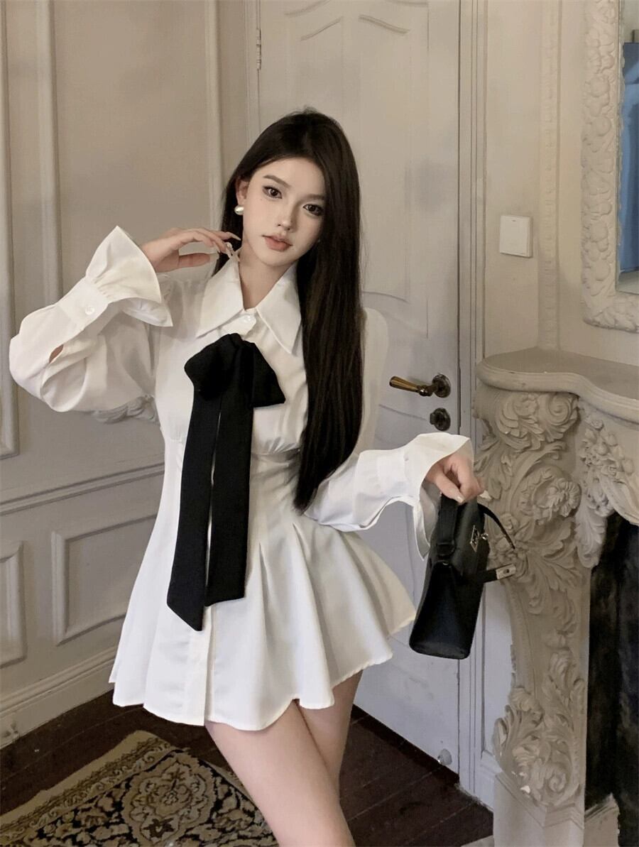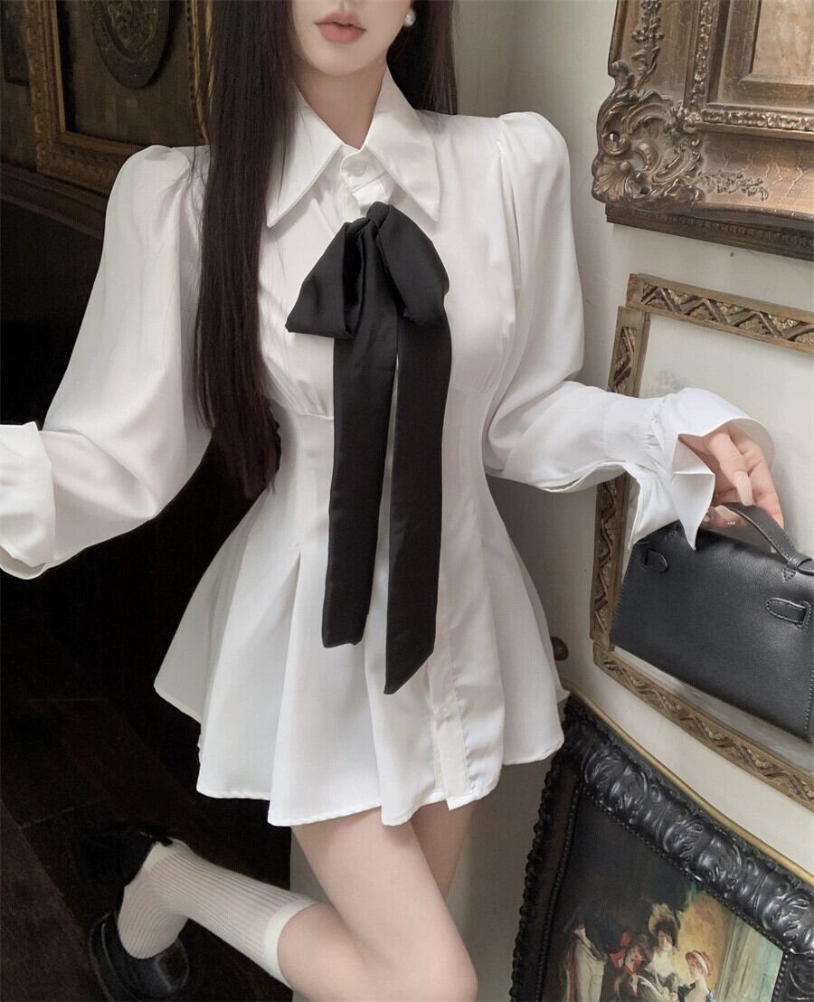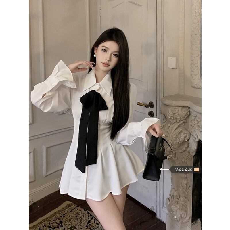 白い長袖シャツドレスの女性の2023年秋の新しいスタイルの軽くて洗練されたロイヤルシスタースタイルのハイエンドウエストショートスカート ロング ホワイト オータム 秋物 857161118770771