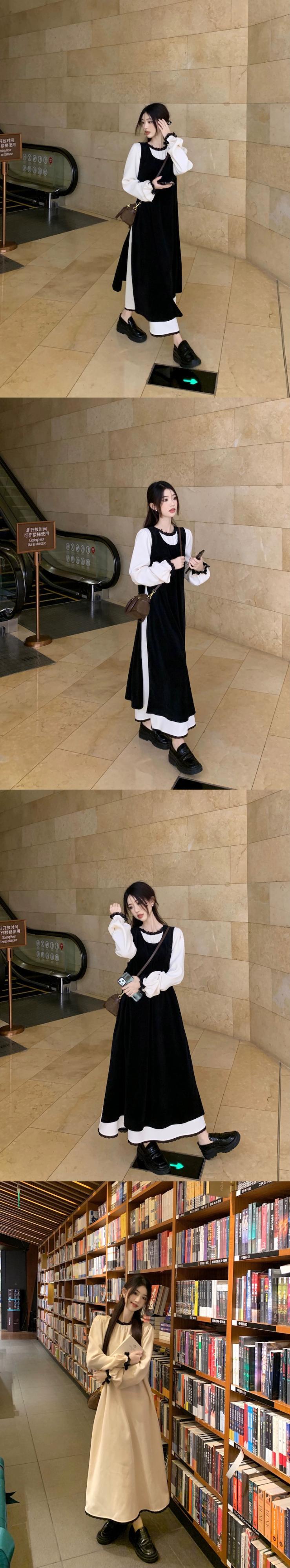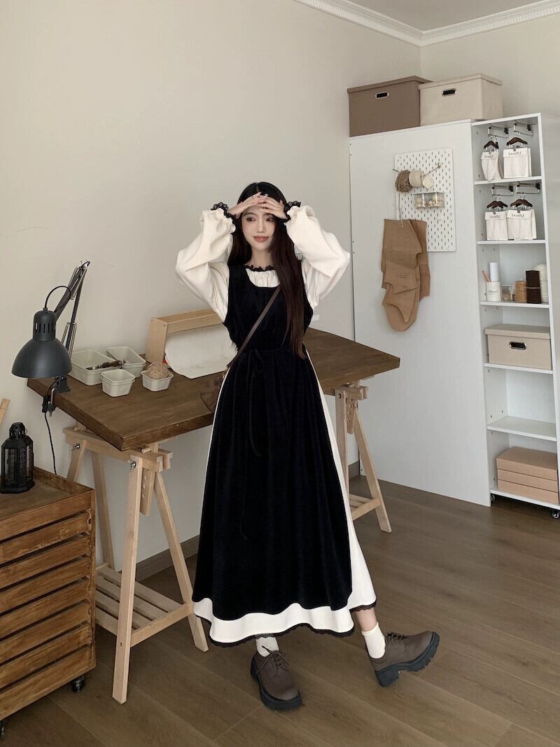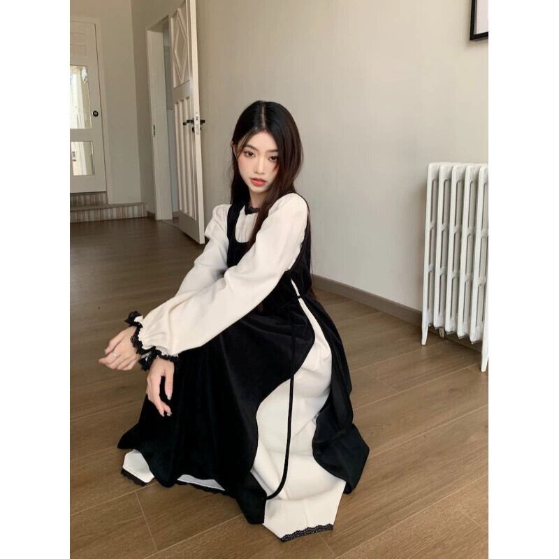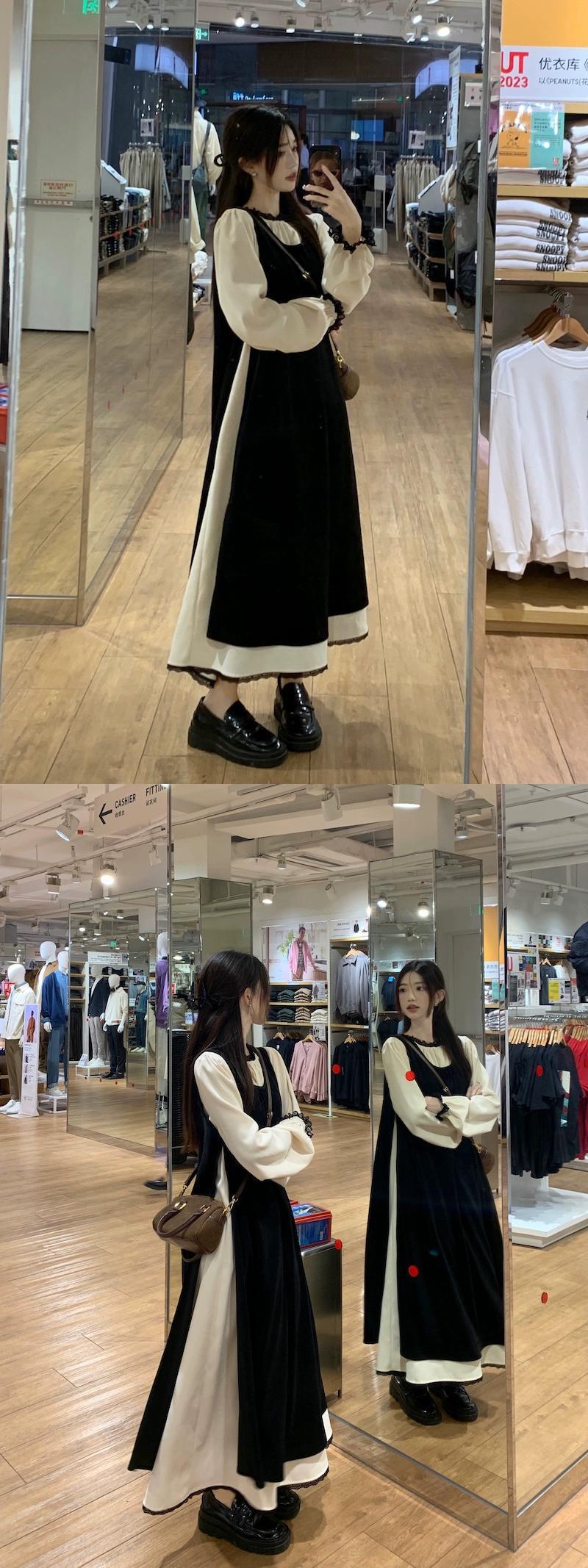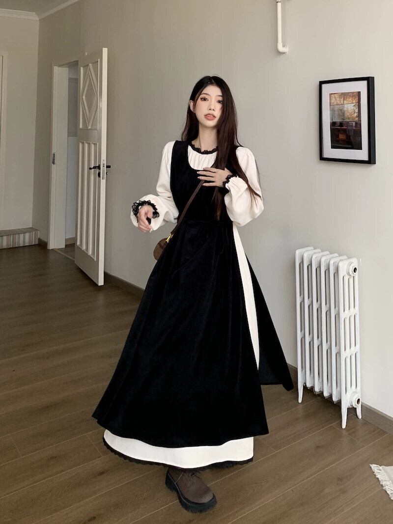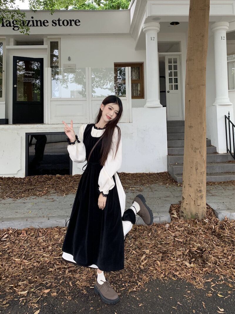 黒のベストドレスの女性の秋の新しいスタイルフランスの優しい気質の高級超美形レイヤードロングスカート レッド ブラック オータム 秋物 8571680353124460