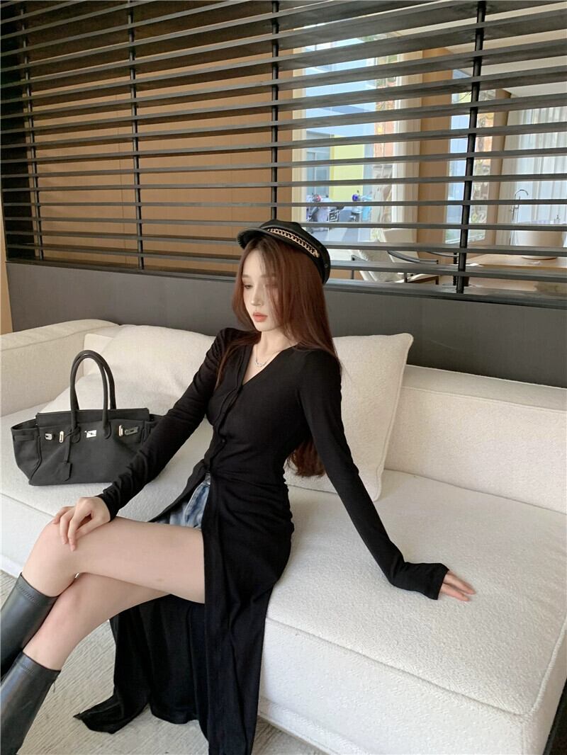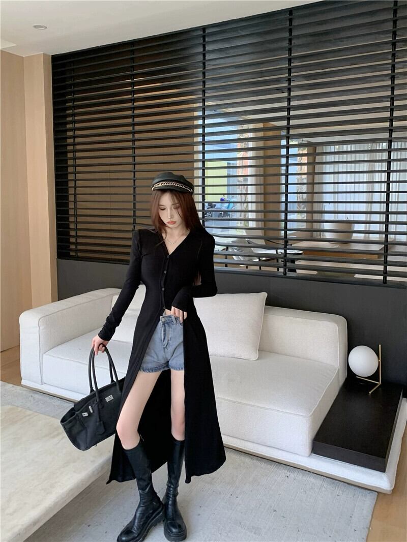 黒のロングニットカーディガン女性の2023年秋の新しいクールな気質と高級Vネックトップ ブラック オータム 秋物 8571650828675983