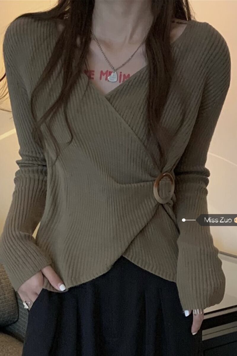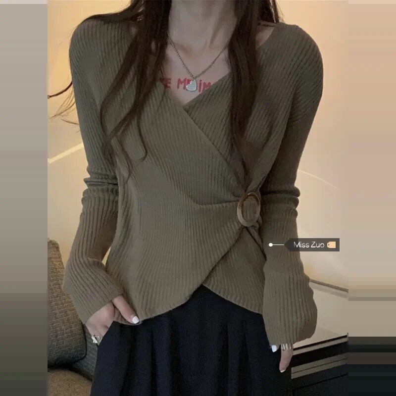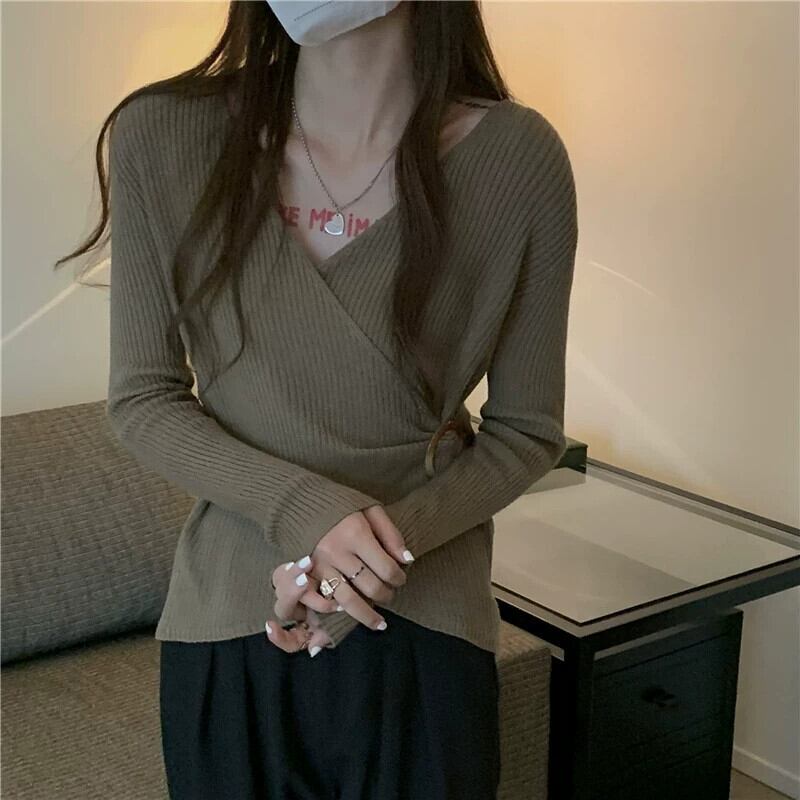 ボトリングシャツ、セーター、女性の秋冬の新しいスタイル、不規則なVネックセーターのデザイン、ニッチスタイルのトップス オータム 秋物 ウィンター 冬物 8571626569614848