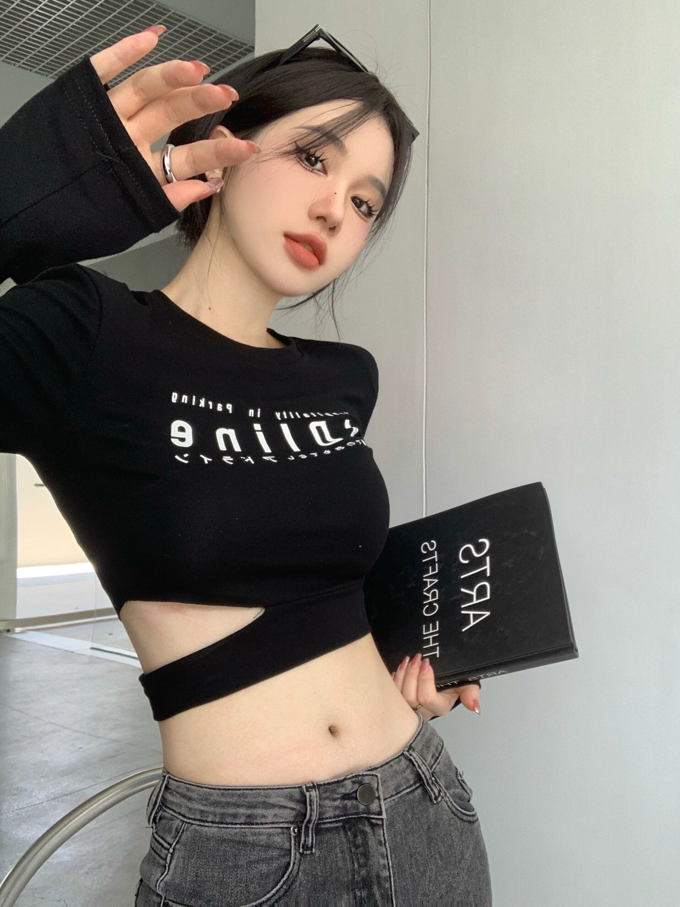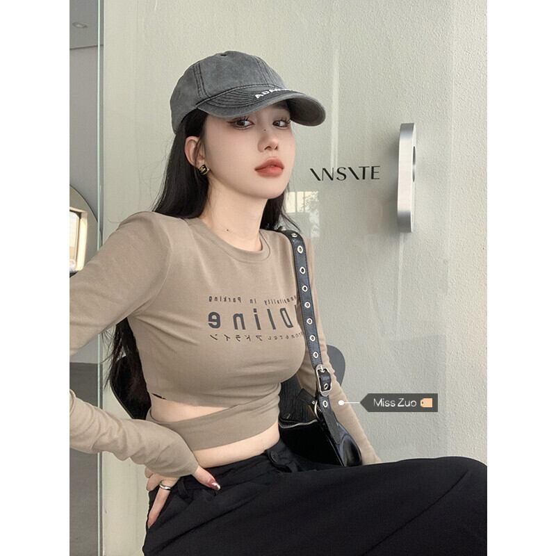 秋のアメリカンスイートタイショートトップレディース、ユニークでユニークなデザイン、ニッチカーキインナー長袖Tシャツ ロング 大人ガーリー スウィート キュート カジュアル オータム 秋物 8571644450398007