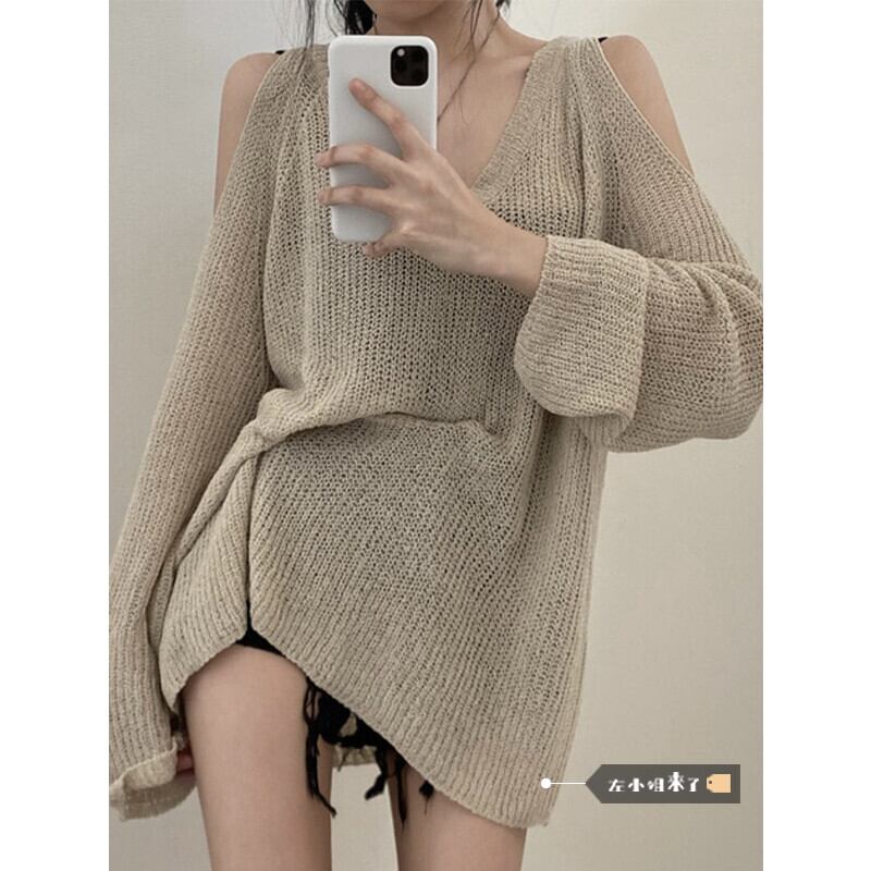 オフショルダー長袖セーターレディース秋薄手アウターカバーアップ2023新デザインニッチVネックトップ ロング オータム 秋物 8571647478472197