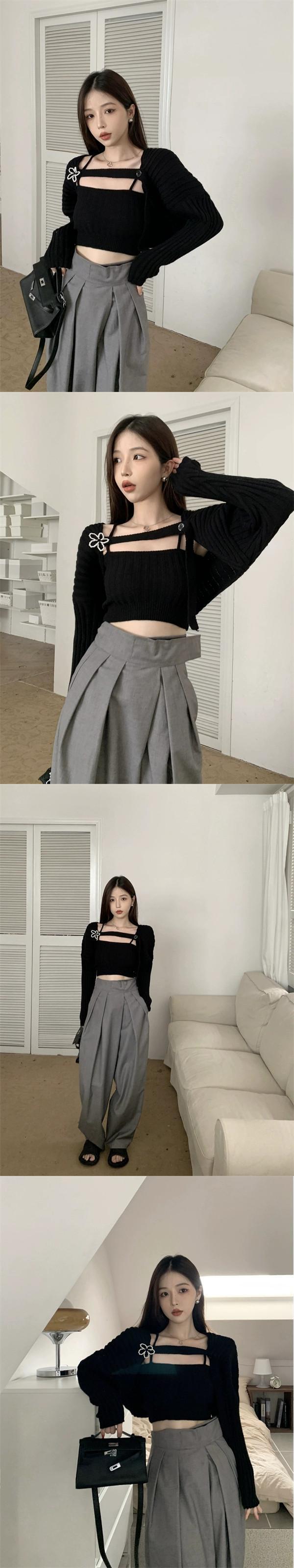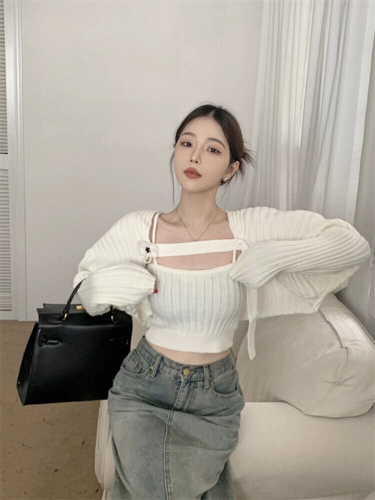 秋のニットカーディガンレディース、サスペンダーベルト、アウターブラウス、ショールジャケット、ニッチシックショートトップス2点セット オータム 秋物 ハーネス 8571628803150626