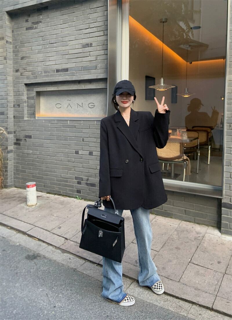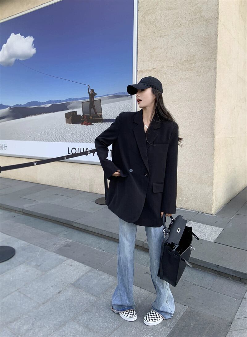 黒のミッドレングスブレザーレディースデザインニッチ2023秋の新しいハイエンドストリートカジュアルスーツ ブラック オータム 秋物 8571627444097108